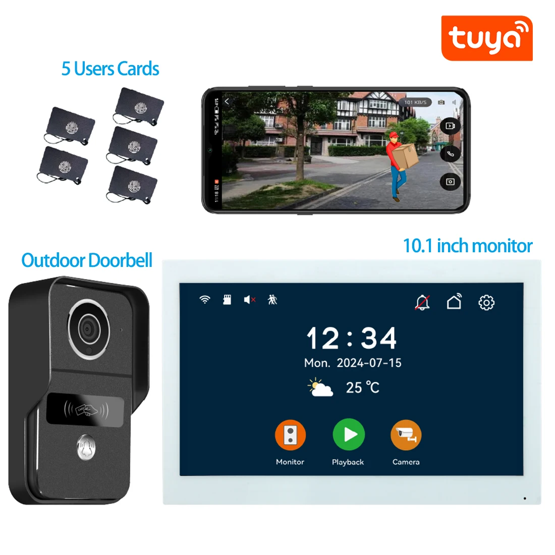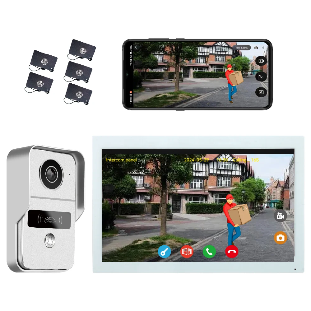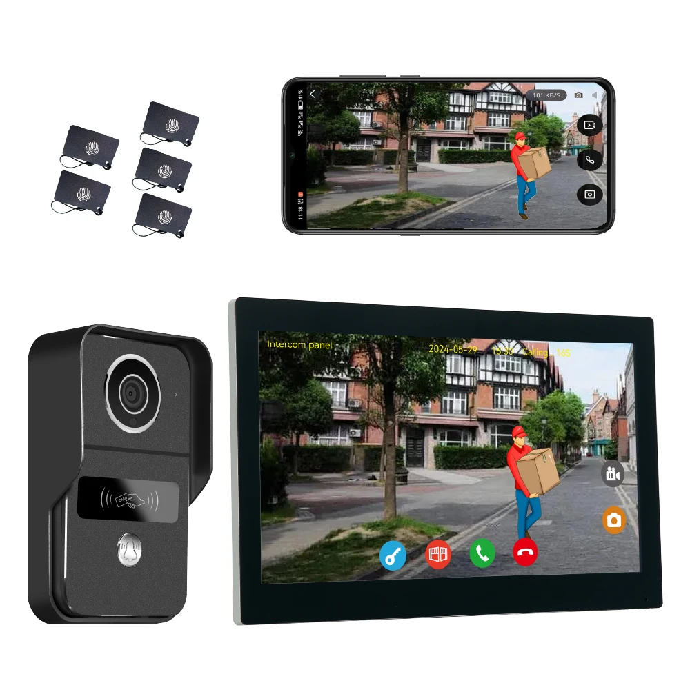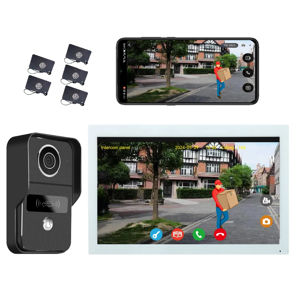 Product Description 10.1inch Touch Screen Wired Video Doorbell Apartment Intercom System 1080P Doorbell Camera TwoWay Intercom for Villa Home Office 2-Wire Digital Video Intercom Kit – See, Talk, & Unlock from Anywhere! Bullet Points: ✅ 10.1″ IPS Touchscreen – Crystal Clear Video & Easy Control ✅ 2-Wire Setup – No Polarity, Easy DIY Installation in Minutes! ✅ Smart Human Detection – Auto-Record Videos/Photos When Someone Approaches ✅ Free App Control – Answer Calls & Unlock Doors from Your Phone, Anywhere! ✅ RFID & Smart Badges – Keyless Entry for Your Family ✅ Connect up to 24 Cameras –Expand Your Home Security System ✅ Weatherproof & Durable – IP54 Rated, Works from -30°C to +70°C Why Choose Our Video Intercom Kit? uD83DuDD39 Easy Installation & No Polarity Forget complicated wiring! With just 2 wires and no polarity issues, you can install this system yourself – no electrician needed. Save time and money! uD83DuDD39 See & Speak to Visitors in HD Whether it’s a delivery person, a guest, or a stranger, you’ll see them clearly on a 10 inch IPS touchscreen. Day or night, the wide-angle camera and IR LEDs ensure a sharp image. uD83DuDD39 Smart Human Detection & Recording The intercom panel detects people automatically and can record video or take photos – so you always know who came by. Set motion zones to avoid false alerts. uD83DuDD39Control Everything from Your Phone Download the Tuya Smart / Smart Life App and connect your intercom to Wi-Fi. Answer calls from anywhere Unlock the door or gate remotely Share access with up to 20 app users View live footage and playback from your phone uD83DuDD39Keyless Entry with RFID Badges Includes 5 RFID badges for keyless access. Just tap to unlock – perfect for family members or trusted visitors. uD83DuDD39 Expandable & Compatible Add up to 24 ONVIF or RTSP cameras to the same system. Perfect for growing your smart home security network. Specification Parameter 10.1inch Touch Screen Wired Video Doorbell Apartment Intercom System 1080P Doorbell Camera TwoWay Intercom for Villa Home Office Monitor Screen 10-inch IPS Touchscreen Camera Resolution 2 Megapixels (CMOS Color Sensor) Video Quality 1024 x 600 px, H.264 Decoding Connectivity 2.4 GHz Wi-Fi (IEEE 8111 b/g/n) Power Supply 24V, 1A (Shared for 1 panel & 2 monitors) Power Consumption Monitor: 3.5W App Support Tuya Smart / Smart Life (Up to 20 users) Smart Features Human Detection, Motion Zones, Auto Photo/Video Recording Access Control RFID Badges (5 included, supports up to 100), Remote App Unlock Wiring Simple 2-Wire Setup (No Polarity) Weatherproof IP54 Rated (Suitable for Outdoor Use) Operating Temp. -30°C to +70°C