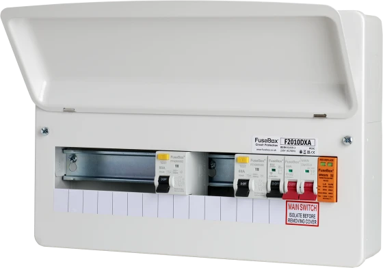 The FuseBox F2010DXA consumer unit features 10 usable ways and comes with 100A Main Switch Incomer, 2 x Type A 80A RCDs, and Type 2 Surge Protection with 32A MCB.Additional features include captive screws on the front cover, round knockouts on all four sides along with 2 large rectangular knockouts on the rear.This consumer unit is supplied with an installation pack which includes a busbar, an icon label pack, and a grommet strip. · · · 10 usable ways · · 100A main switch incomer · · 2 x Type A 80A RCDs · · T2 surge protection & 32A MCB
