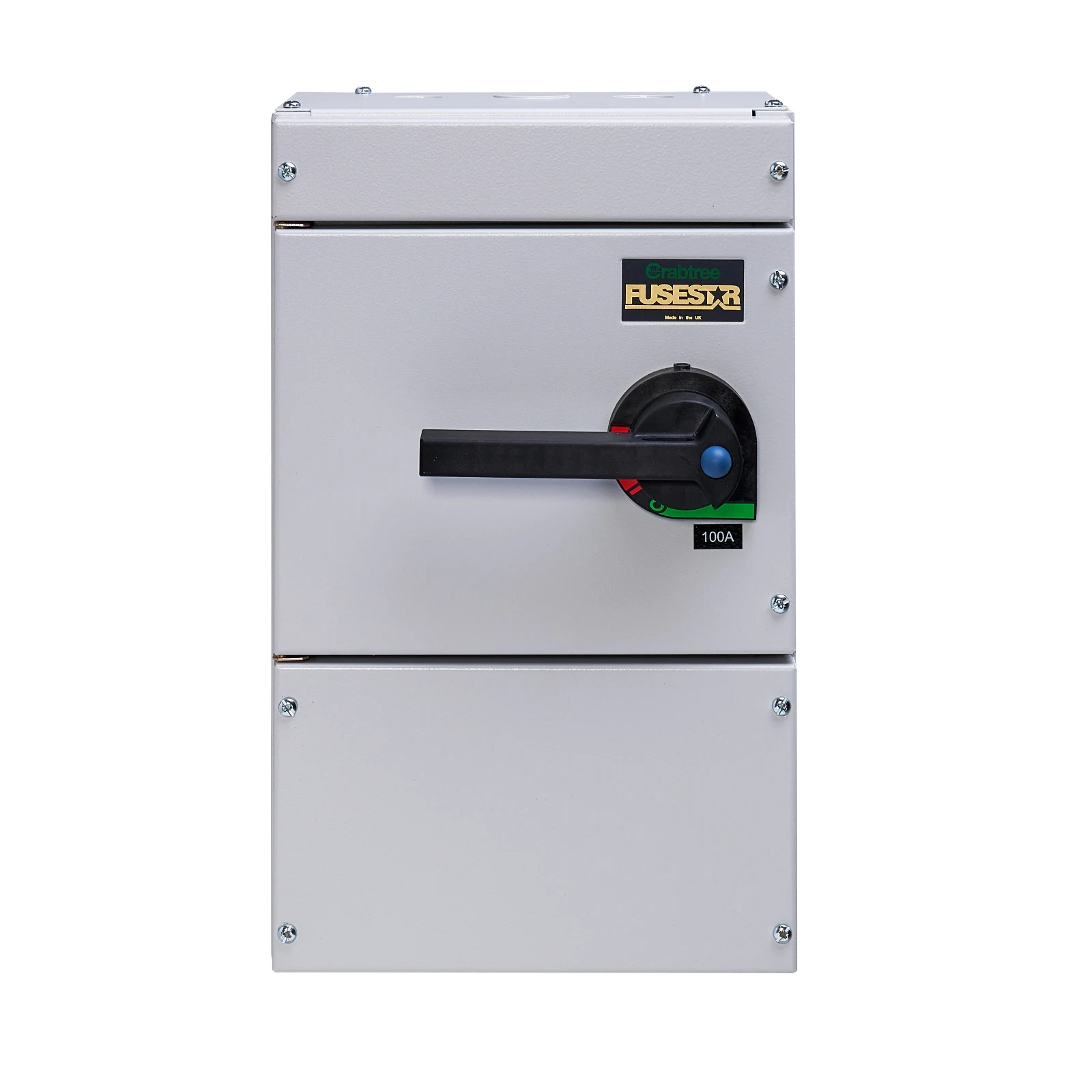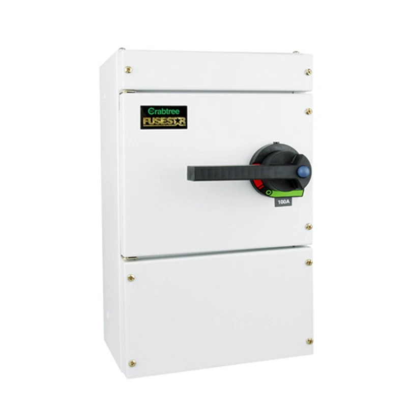 The Crabtree Fuse Consumer Unit is designed to exceed the requirements of EN 60947-3 and IEC 947-3, to ensure quality and competitiveness. Suitable for isolation of circuits, with a utilisation category AC23A and a Fused short-circuit capacity of 80kA. Th · · · Supplied with 100A fuses. · · Painted RAL 7035 steel enclosure 425mmH x 263mmW x 188mmD. Front door reversible, opening to 180° · · Operating handle can be padlocked. · · Accommodates cable spreading room up to 70mm² 4 core. · · Spreading room is allowed for at one end only. To fit a 4 core cable at both ends an additional cable spreader (19100CSB) is required. · · Frequency rating 50/60 Hz · · Handle padlocking facility locks switch & door in off position · · Fused Short Circuit, 80kA RMS · · Switching speed totally operator independent · · Handle padlockable on or off