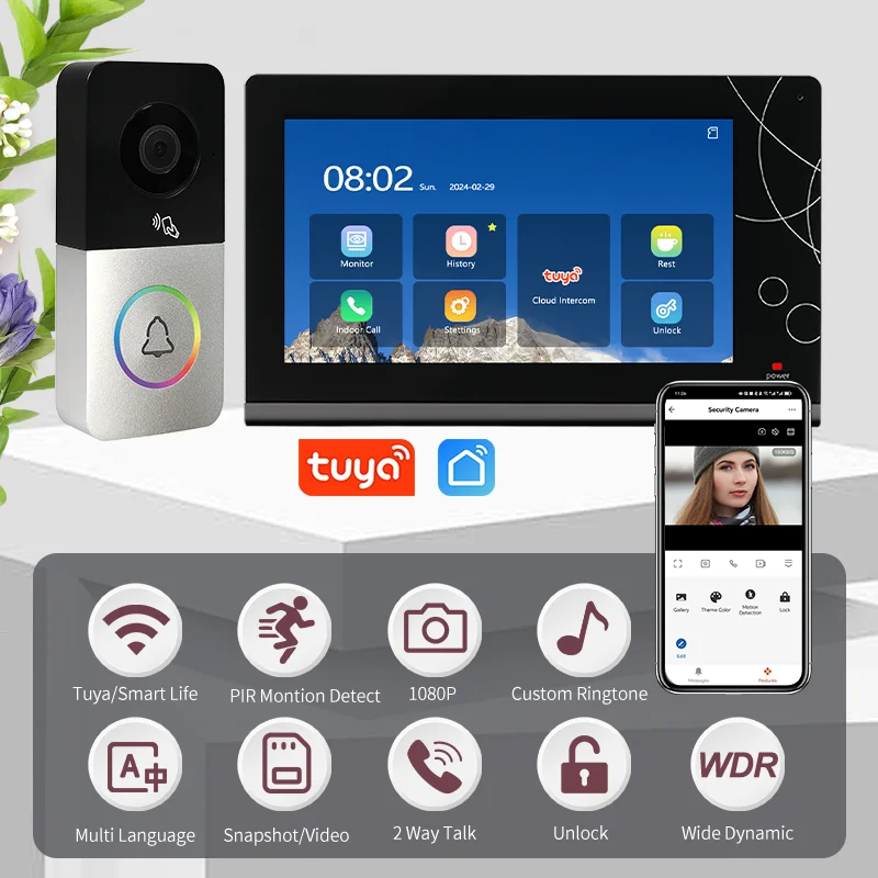 1080P WiFi/ Wired Video Intercom System with PIR Night Vision Video Recording Remote Unlocking Smart Doorbell Camera for Villa