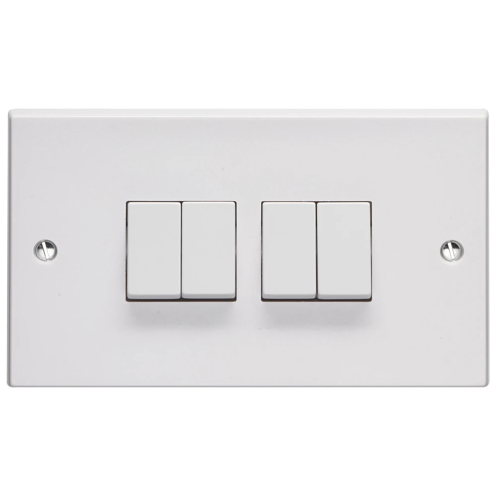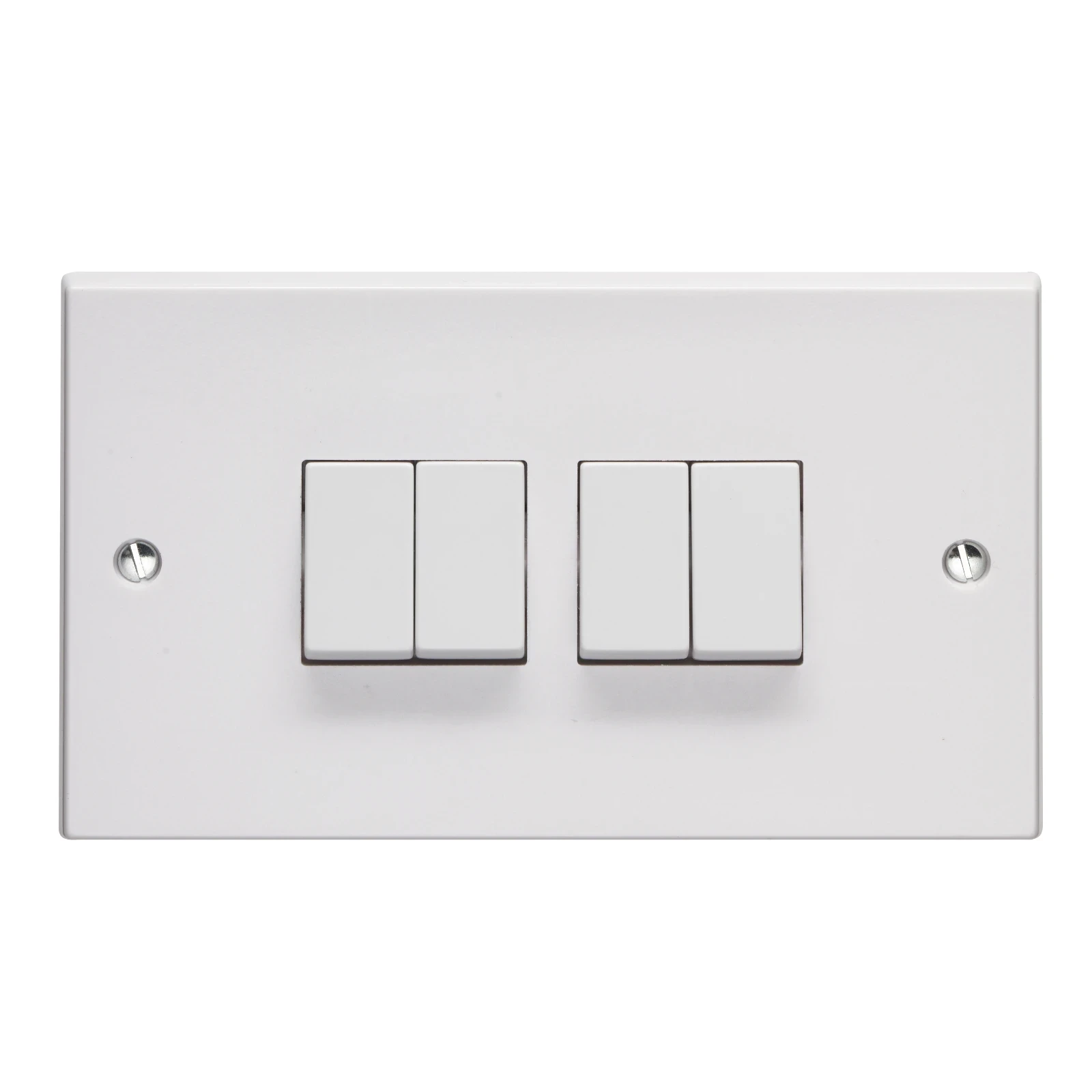 Volex Wall Switch is having 4 Gang, 2 Way and 10A current rating. Terminals suitable for 4 x 1.0mm² , 3 x 1.5mm² or 1 x 2.5mm² conductors. This product range includes a wide array of lighting and power controls to suit any domestic and many light commercial installations. · · · Fully Rated for Fluorescent Loads