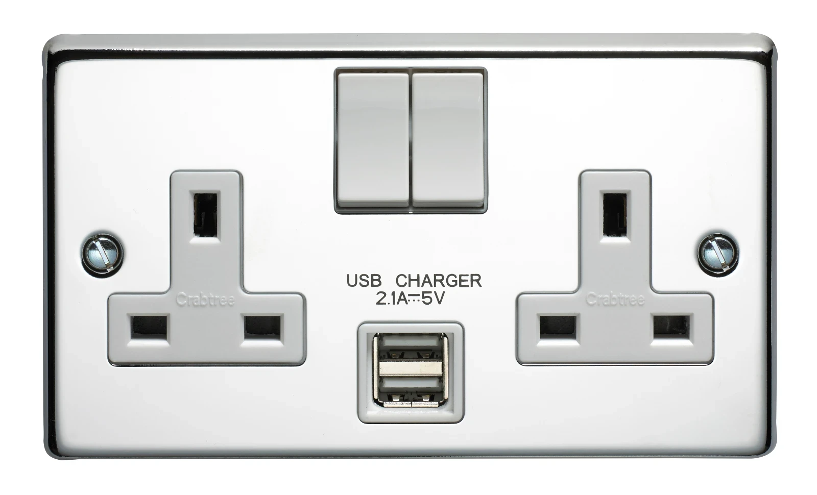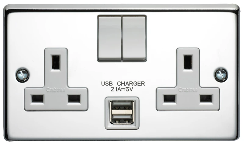 13A 2 Gang Double Pole Switched Socket With Dual 2.1A USB s Polished Steel Finish