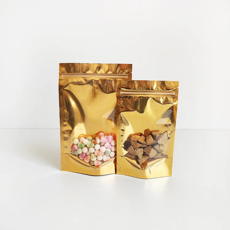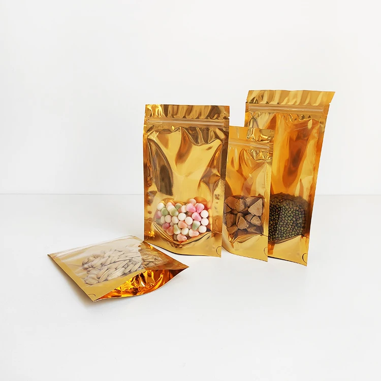 14x20cm Clear Front Window Glossy Gold Aluminium Foil Metallic Stand up Storage Pouch Zipper Mylar Bag for Food Packaging