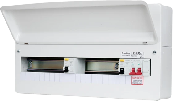 The FuseBox F2017D80 consumer unit features 17 usable ways and comes with 100A Main Switch Incomer and 2 x Type A 80A RCDs.Additional features include captive screws on the front cover, round knockouts on all four sides along with 2 large rectangular knockouts on the rear.This consumer unit is supplied with an installation pack which includes a busbar, an icon label pack, and a grommet strip. · · · 17 usable ways · · 100A main switch incomer · · Earth and neutral terminal bars at the top · · Removable and raised DIN rail