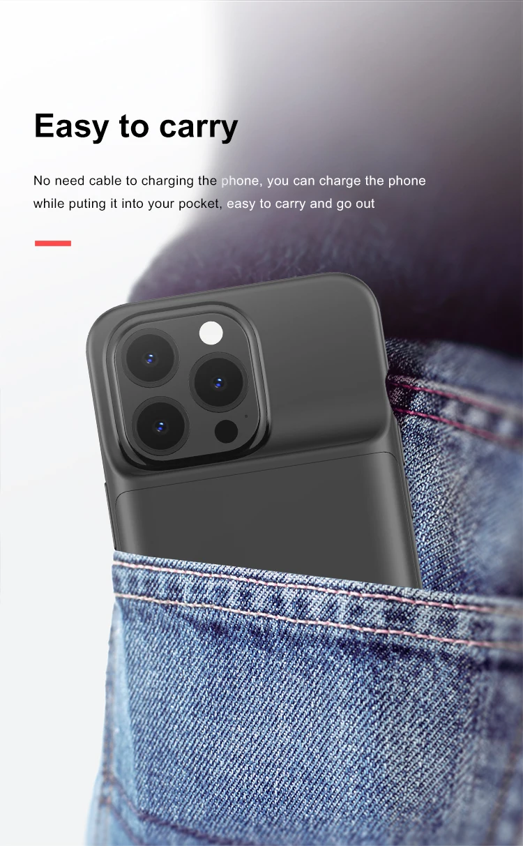 Product performance description Sell Point: 1. Ultra thin 16mm, no adding bulk,wireless Magnetic charging; 2. 4-side protection, camera lens protection; 3. Matte finish, no sweats, no fingerprints; 4. Little bit hard offers excellent grips; 5. 1:1 precise cutouts for ports and buttons; 6. No mould marks. 7. Adopt A high capacitance cell. 2. All-wrapped soft adhesive material with audio function 9. Customized LOGO, gift list and OEM orders are availableWireless Charging Battery Phone Case For iPhone 13 Series Quality Control Strictly checked and tested one by one to make sure all products are in good condition before shipping Function Wireless Charging ana Battery Phone Case Colors Black Input 5V/2A Product Usage Recommended by seller 2024 New Products 4000mah Power Bank Built in Cable Portable Battery Powerbank As a Back Clip Phone Holder Phone Charger case.