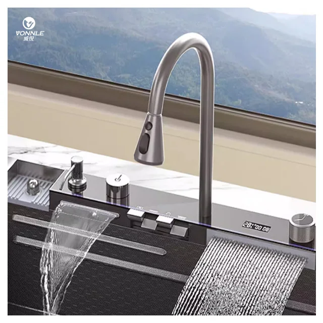 Edition Smart LED Digital Display Kitchen Sink Multifunction Modern Waterfall Stainless Steel Single Bowl with Five Holes