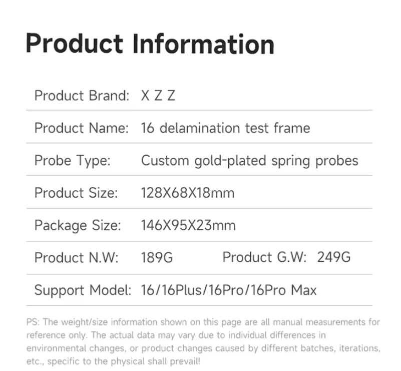 Product Description Specification Name: XZZ iPhone 16 delamination test frame. Probe Type: Custom gold-plated spring probes. Product Size: 128X68X18mm. Package Size: 146X95X23mm. N.W: 189G. G.W: 249G. Support Model: iPhone 16/ 16Plus/16Pro/16 Pro Max. 1.