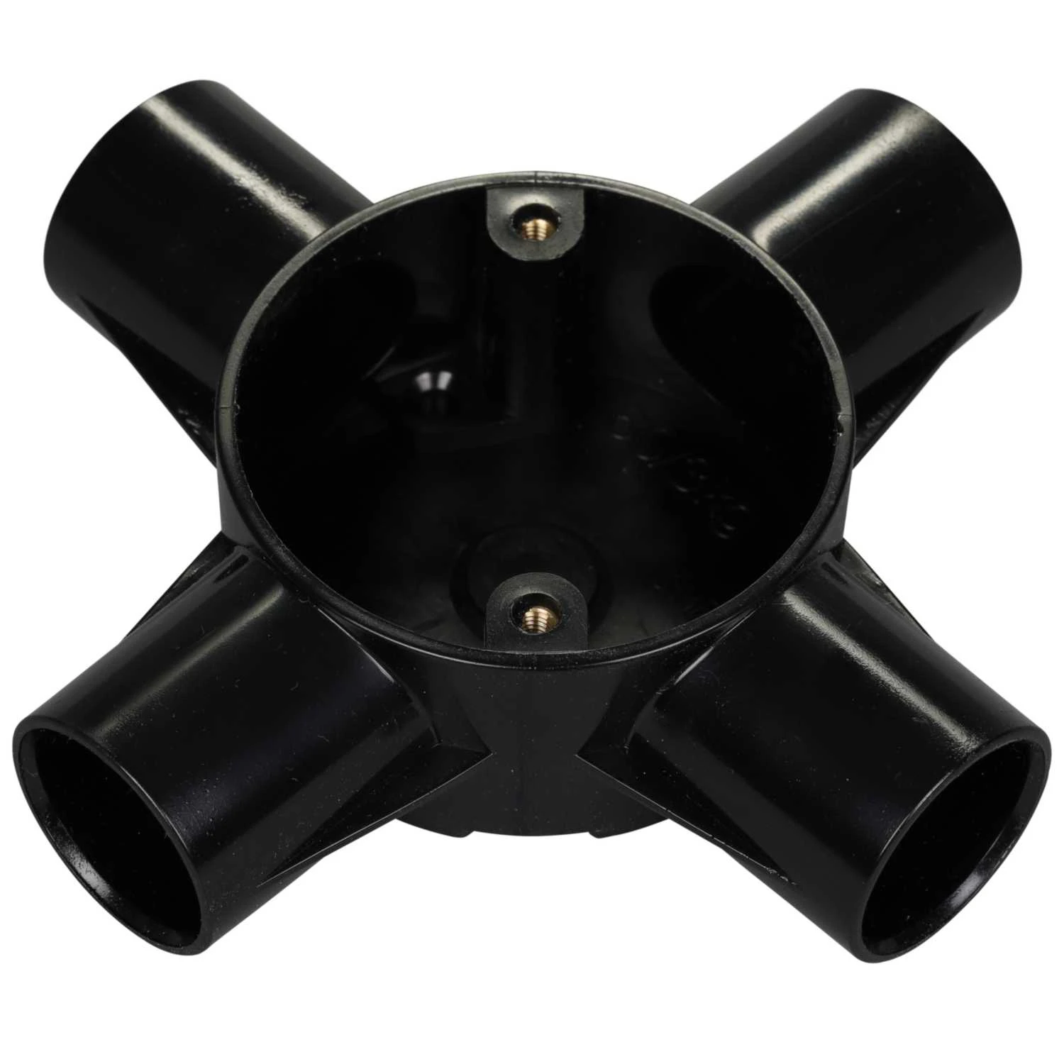 Marshall Tufflex 4-Way Box is made of PVC-U with round 20mm conduit. PVC-U plain bored boxes are suitable for suspending loads of up to 3kg centrally at 60°C maximum. Fixing centres at 50.8mm and fitted with M4 brass inserts. · · · With round 20mm conduit · · Suitable for suspending loads of up to 3kg centrally at 60°C maximum · · Fitted with M4 brass inserts · · Provision for MET1 brass earth terminal · · All boxes have threaded brass inserts · · Manufactured using 100% recycled material