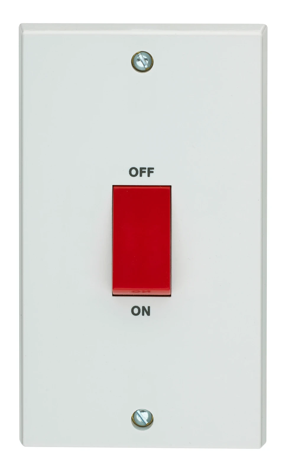 Volex VX9703 2 Gang 2 Pole 45A control switch with large plate. Terminals suitable for up to 1x16mm² cable. Fits surface moulded VX9416 large plate, SB618 flush metal, SB628 large plate mounting boxes. It conforms to BS EN 60669-1. White in colour. · · · Fully Rated to 45A · · Current Rating: 45A · · Height: 145mm · · Width: 85mm · · Min Box Depth: 42mm