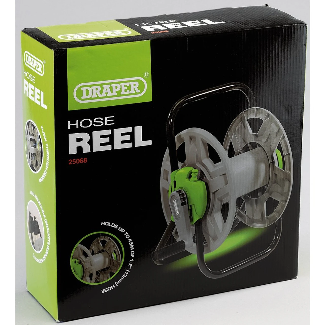 Rust and corrosion resistant frame with tough plastic snap together parts. Floor standing with wall mountable brackets Supplied separately (Stock No. 63642). Reel helps keep hoses tidy and prevents hoses from kinking. Reel holds approximately 45 metres. · · · Rust and corrosion resistant frame · · Floor standing with wall mountable brackets · · Reel holds approximately 45 metres · · Snap-together construction: The cart is easy to assemble, and the snap-together construction makes it easy to disassemble for storage.