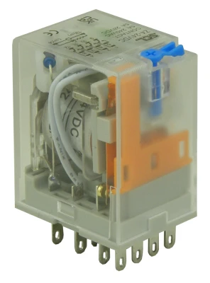 A 5 amp 4 pole 14 pin plug in relay 24Vdc With Test Button, Flag & Led Indicator is an electromechanical switch that is used to control high-current loads with a low-current signal. It has a coil that is energized by a 24VDC voltage, and when the coil is energized, it closes a set of four contacts. The contacts can be used to switch a variety of loads, such as motors, solenoids, and lights. · · · 14 Pin plug in power relay · · 4 Pole configuration · · 5 Amp switching capacity · · Change over contacts · · AC & DC Coils · · Lockable test button, flag & LED indicator · · Industry standard terminations · · DIN Rail & PCB sockets available