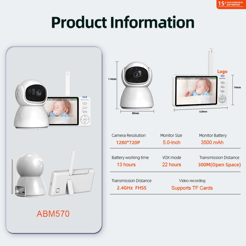 Product Name Baby Monitor Camera Power Supply 5V 1A Model number ABM570 View Angle 75 ° Front Lens SENSOR COMS Camera Focal length 4mm Battery Capacity of Monitor 3500mAh Camera Power Consumption 1W Monitor Power Consumption 1.3W Display 5-Inch Operating Temperature -4℉-149℉ Camera Resolution 1280*720P Certification FCC CE ROHS Transmission Distance 300M( In Open Space) Transmission Method 2.4GHz FHSS Crying Alarm Support Temperature Detection Support Feeding Alarm Support Lullabies Support PTZ Function PTZ function support(Pan/Tilt/Zoom) Nigh Vision(Automatic) Support Material PC+ABS Title goes here. 1. 5-Inch Color Touch Screen 2. New Two-way Talk Back Intercom 720P Baby monitoring Camera + 720P Monitor 3. Lower Power Consumption 4. IR – CUT automatic switching to meet clear night vision 5. Sensitive Temperature Detection 6. VOX Detection Function Wake-up Mode 7. Built-in 8 lullabies in the Camera 8. 3500MA Large Capacity Lithium-ion Polymer Batteries Screen Lighting 9. 355 Degree Manual Rotation, 75 Degree View Angle, and 120 Degree Vertical View Angle 10. Feeding Alarm, Temperature Detection, Crying Alarm Customer reviews Why Choose Us Exhibition Contact Us Product Description Recommended by seller 5″ Display 720P Baby Phone Camera 2.4G Wireless Two-way Audio Nanny Feeding Alarm Temperature Sensor Baby Monitor 5 Inch Wifi.