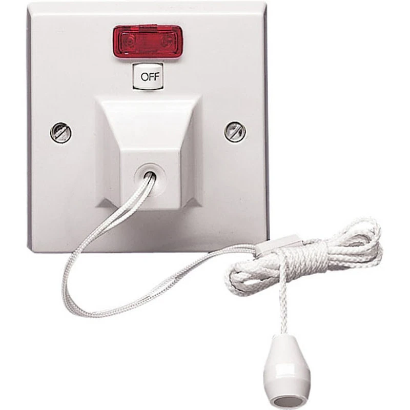 Ceiling pull cord switches are normally used in bathrooms because it acts as a safety feature because you may have wet hands when operating the switch, therefore a cord as switch protects you from getting a shock. · · · Double Pole Switching · · Neon Indicator · · Mechanical Position Indicator · · 99mm Diameter · · Fitted with 2 earth terminals