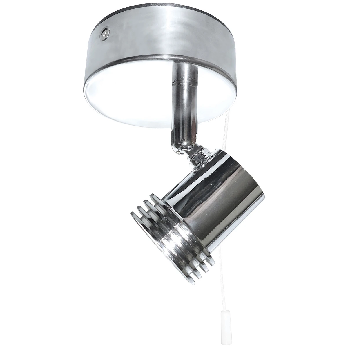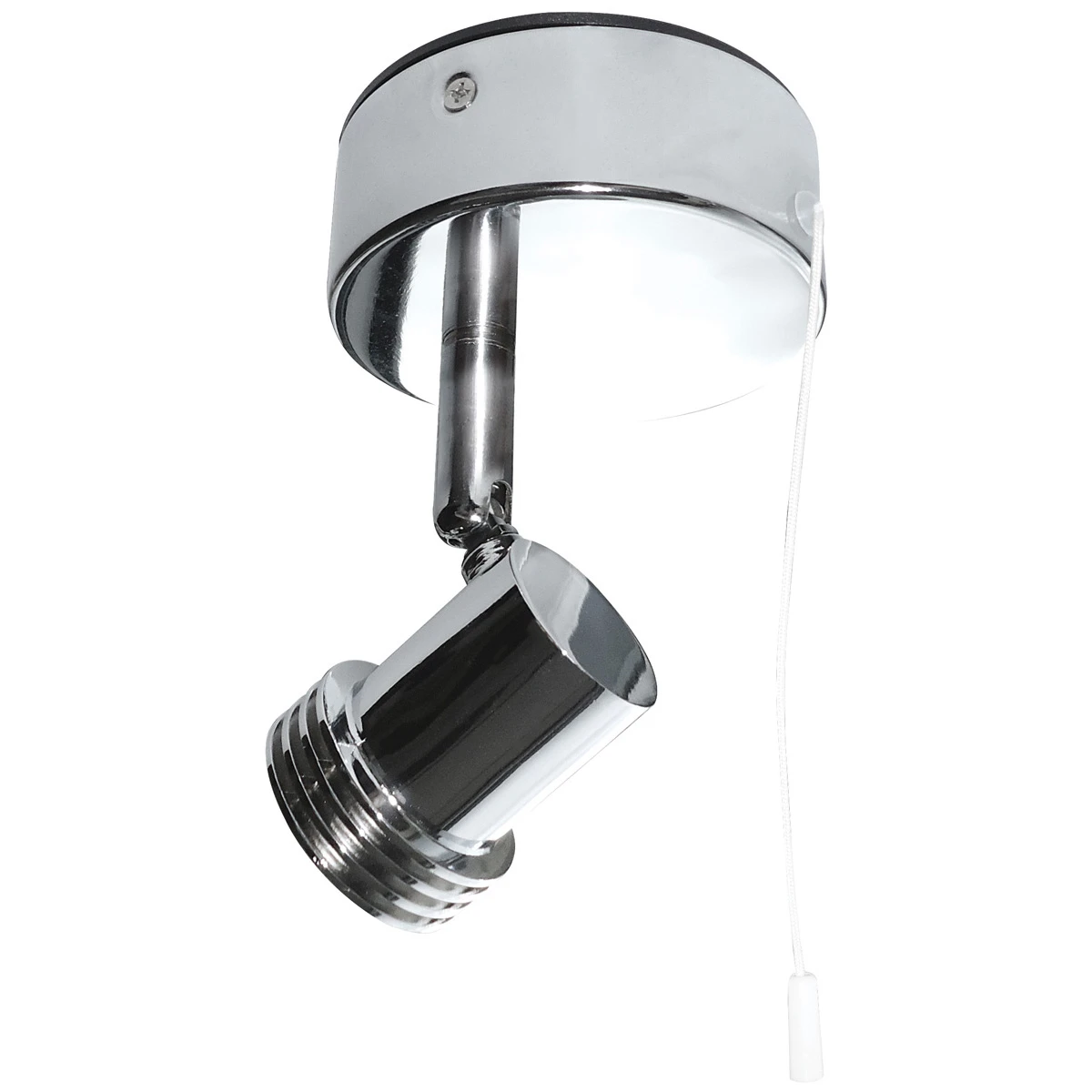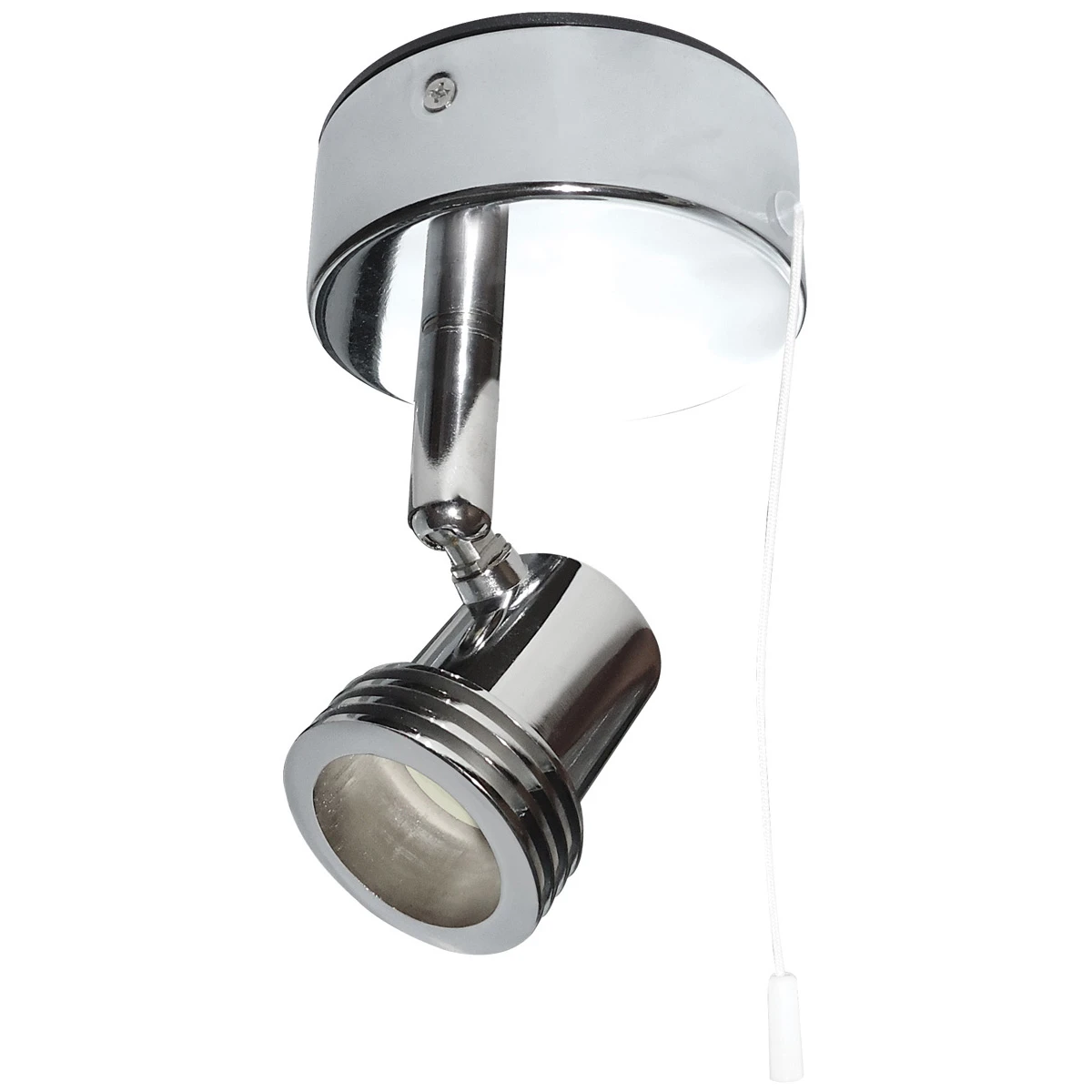 Polished chrome 50W Max GU10 single spotlight with pull cord on/off switch · · · spotlight, GU10, display, wall · · Fully adjustable cast alloy head · · Circular concealed fixing plate · · Pull cord on/off switch