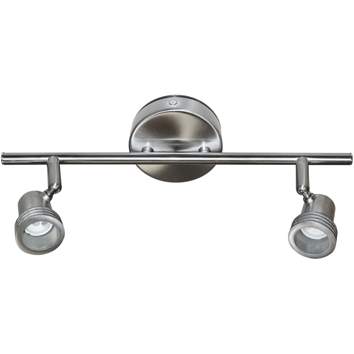 Brushed nickel 50W Max (per lampholder) GU10 twin bar spotlight · · · spotlight, GU10, display, wall, bar · · Fully adjustable cast alloy head · · Circular concealed fixing plate