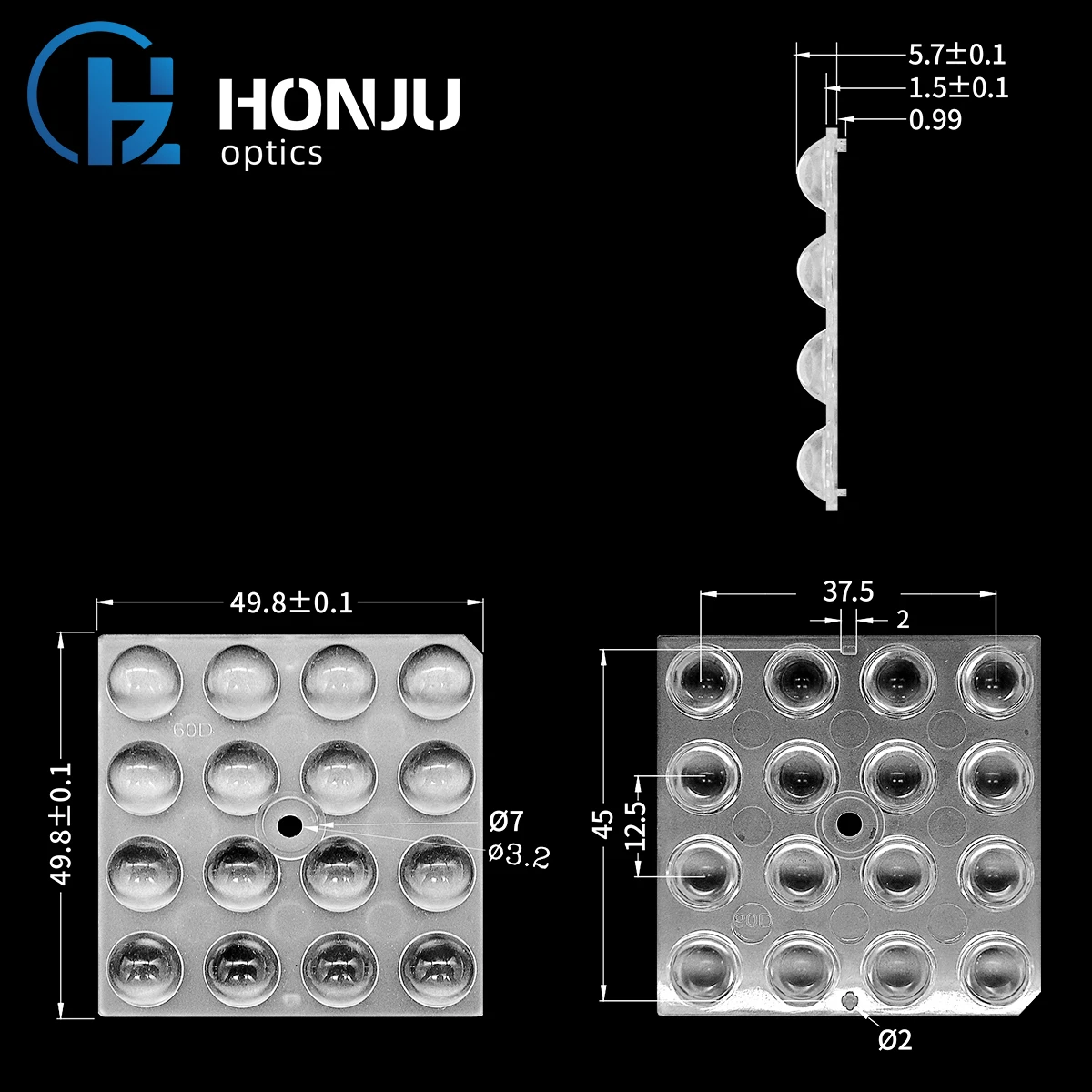 Part No: HZ-5050-16H1-60 Degree-5050 Module light lens Describe Hongzhu 16 in 1 vertical 5050 Module light lens PC-UV led lens array for 5050 led Dimension(mm): 49.5*49.5mm Material: PC 1250Z Transmittance: 92% Application|: Street lamp, projection lamp Usage: road lighting Temperature resistance(℃): 125 standard angle: 60° Match LED: 5050 Recommend Products Product packaging 1.Use shock-proof materials for product packaging, such as foam plastic or air bags, appropriately sized and shaped boxes or packaging boxes to ensure that the lenses are not squeezed or bumped during transportation. 2.Print clear product model,specifications, brand information and manufacturer information on the packaging. 3.Mark appropriate warnings on the packaging,such as “handle with care”, “fragile items”, etc., to remind users to be careful when handling lenses. BUYERS SHOW COMMERCIAL LIGHTING