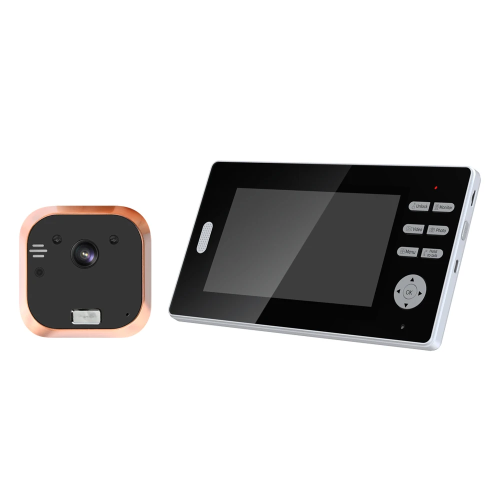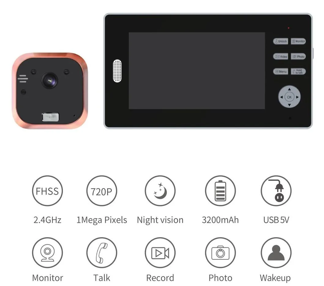 Product Description Specification Parameter Specification Product Type 2.4G Wireless Peephole Video Doorbell Display Screen 7-inch high-definition LCD Wireless Technology 2.4GHz digital frequency hopping and encryption Transmission Distance Up to 50 meters Night Vision Infrared CUT switch night vision (5 meters) Intercom Supported Monitoring Supported Video Function Supported Photo Function Indoor monitor can take photos or videos (auto/manual) Melody 12 chord melody Date & Time Display Yes Battery Type 3200mAh lithium battery (indoor & outdoor units) Unlock Control Supports electric lock and electromagnetic lock Indoor Unit Size 236 x 130 x 18 mm Outdoor Unit Size 102 x 70 x 14 mm; Cat eye diameter: 14 mm Angle 120° Brand OEM Model Number WD702 Network 2.4G Horizontal Angle 150° Doorbell to Indoor Monitor Distance 50 meters Night Vision Range 5 meters Recommended by seller 7-Inch IP55 Terminal Relay Output Color Video Fingerprint Recognition Door Access System.