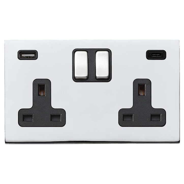 switched socket USB+C 2 · · · Concealed fixing · · Bright Chrome · · Fit & Forget: 25-year guarantee
