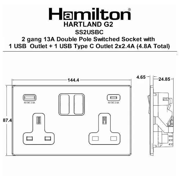 7G27SS2USBCBC-W Hamilton HARTLAND G2 switched socket USB+C 2 Gang
