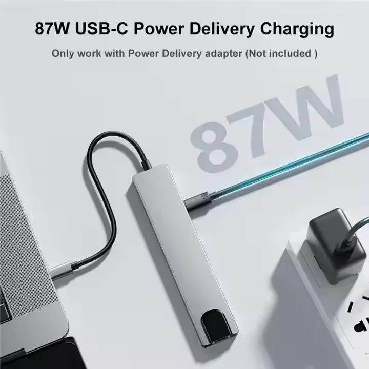 1 Product weight/size 17*7*1.5cm 79g 48X36X28CM 200/CTN 3 Product material ABS+PC+Aluminum alloy 4 Feature 1,HD resolution:4K*2K(3840*2160)30HZ/4K*2K(3840*2160)60HZ, downwards compatible with 1080P 720P etc. 2,USB3.0:Hight speed USB3.0 transmit 5GB/S,Power supply up to 4.5W max 3.USB C Female port:20V@3A,Support max 87W power adapter, 4,USB C male:copatible with thunderbolt 3,Make sure that the host USB-C port on your device complies with the USB3.0/3.1 Specification 5,SD / TF card reader:SD and TF cards can work simultaneously, read and write speed depands on cards’ quality 6,RJ45: Max Ethernet speed: 100Mbps Comply with USB-C interface specification built in conversion chip,plug and play Interfaces -1*USB 3.0+1*USB2.0 ports -1* USB type c port -1* 4K 30Hz HD port -1* RJ45 Ethernet port -1* USB c female charging port -1* SD slot -1* TF slot Recommended by seller 11/10/8/7/6/5/4/3 in 1 Usb C Hub Docking Station Adapter for Laptop Usb 3.1 Type-C Hubs with HDTV VGA RJ45 SD TF Audio Pd 100w>.