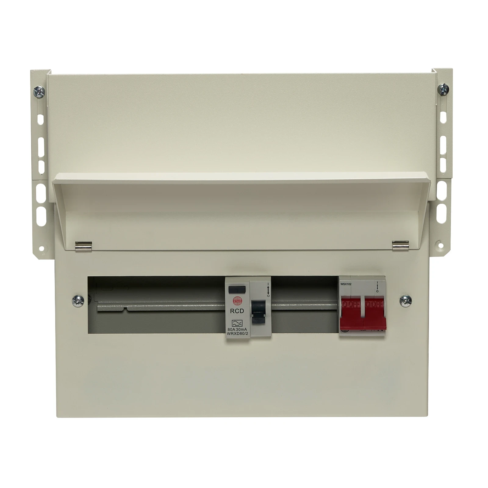 Wylex Meter Cabinet Consumer Units (aM3 Metal Cased skeleton) · · · All metal meter cabinet consumer unit · · Flexible busbar assembly · · 9W Split load · · 320mm fixing centres · · 1x 80A 30mA type A RCCB · · Fully compatible with Arc Fault Detection Devices (AFDD) · · c/w knockouts · · 80A rcds