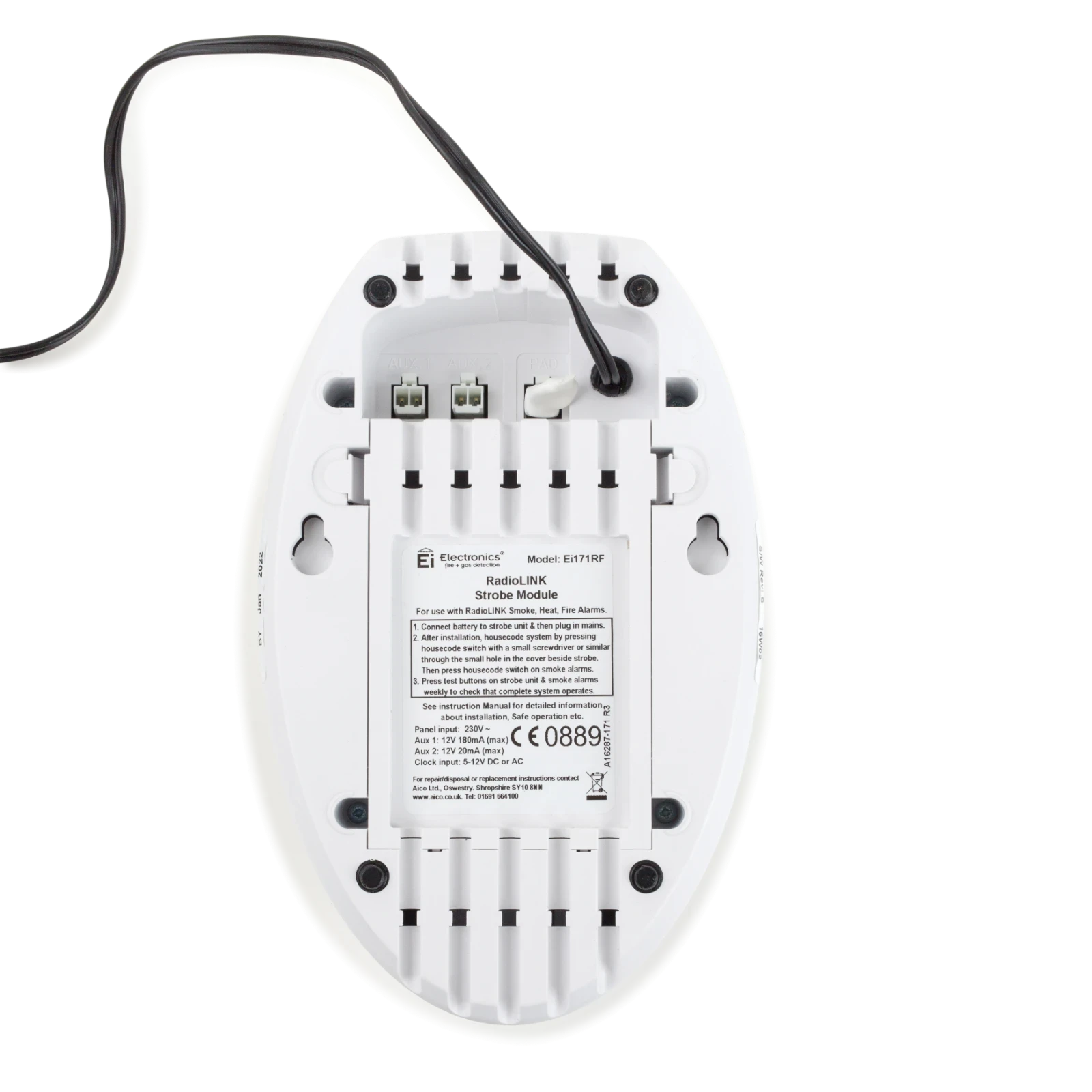 RadioLINK Flashing Strobe. 230V with Rechargeable Back-up · · · Flashing strobe light for daytime rooms · · Mains powered with rechargeable lead acid back-up · · Wireless interconnecton with SmartLINK, RadioLINK+ and RadioLINK Alarms · · 5 year guarantee · · Clear indicator LED’s · · Large test button · · Auxiliary input socket · · Uses Radiolink wireless technology to interconnect · · Aico EI171RF Advanced transceiver and signal coding technology to ensure robust and reliable RF signalling · · House code feature that allows a system of alarms and devices to be coded together to prevent interference with neighbouring systems