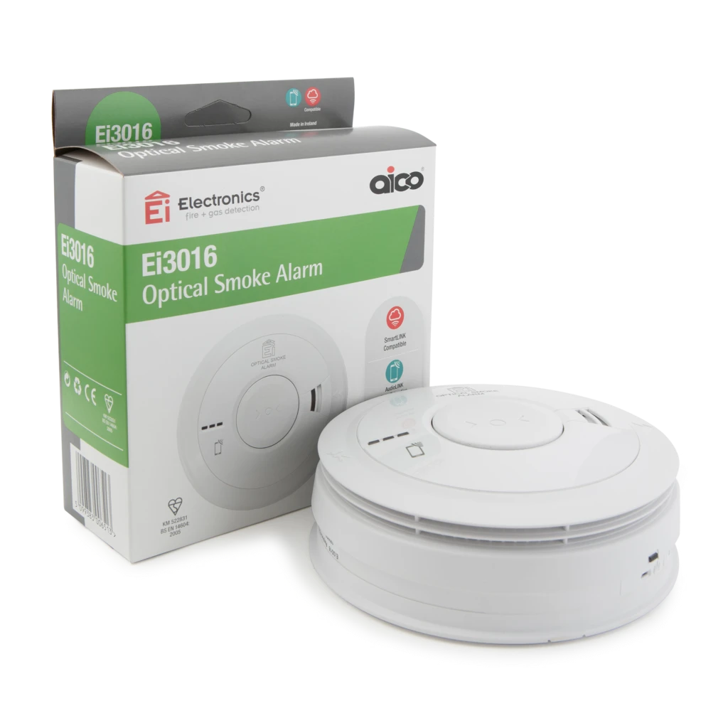The Ei3016 Optical Smoke Alarm contains a tried and tested high-performance optical smoke sensor, which is best for detecting slow, smouldering fires in the home in either the living room, bedroom, hallway, landing, or dining room. In addition, the smoke chamber design has an integrated insect screen and unique automatic dust compensation reduce the risk of false alarms · · · Contains a high performance optical sensor · · Mains powered with 10 year rechargeable lithium cell back-up · · Supply Voltage: 230V AC, 50Hz · · Sound Level: 85dB(A) at 3m · · Plastic Material: UL94VO flame retardant · · Fixing: easi-fit base (supplied) · · Button Test: Checks sensors, electronics and sounder · · Battery Back-up: Rechargeable lithium cells · · Aico Ei3016. SmartLINK: Compatible via the Ei3000MRF Module · · Guarantee: 5 years