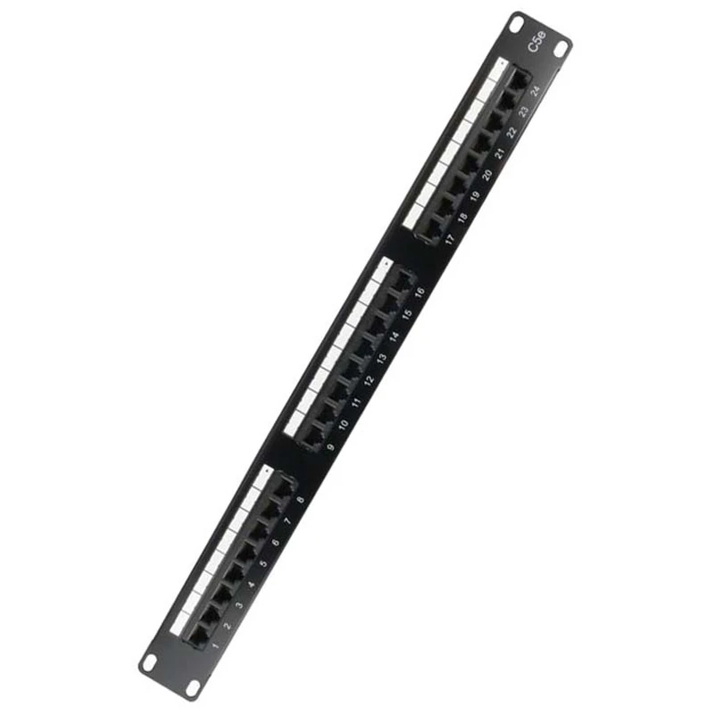 24 port Cat 5e patch panel that offers Category 5e performance when installed using uTP Cat 5e cable. This 1u high patch panel fits all 19″ cabinets and racks.IDC rear termination, RJ45 socket presentation on front of panel. · · · 24 Ports · · Cat5e · · Fits all 19in cabinets and racks · · IDC rear termination · · RJ45 socket present on front of panel