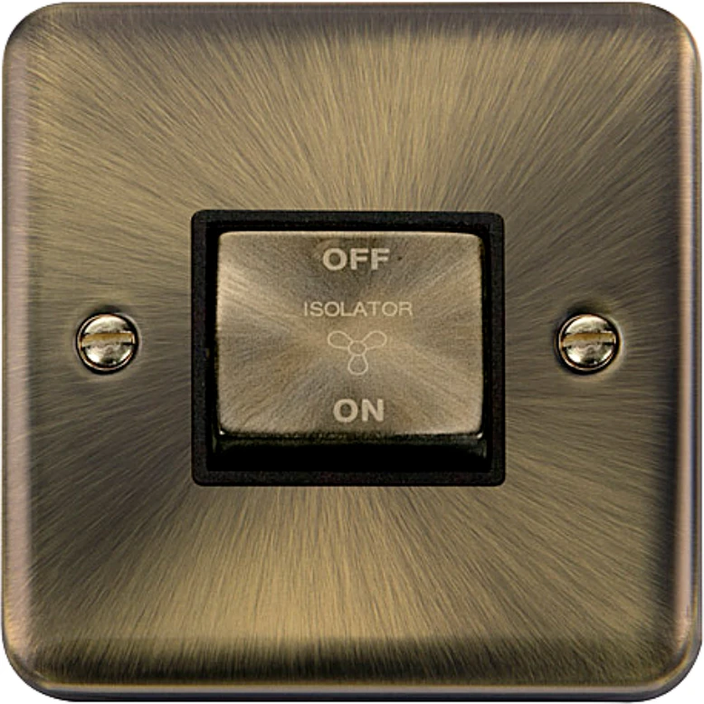 Deco plus black insert antique brass rounded profile 10a ingot 3 pole fan isolation plate switch. · · · Plate Dimensions (mm) 88 (W) x 88 (H) x 8 (D) · · Style Rounded Profile · · Finish Antique Brass · · Anti Microbial Certified No