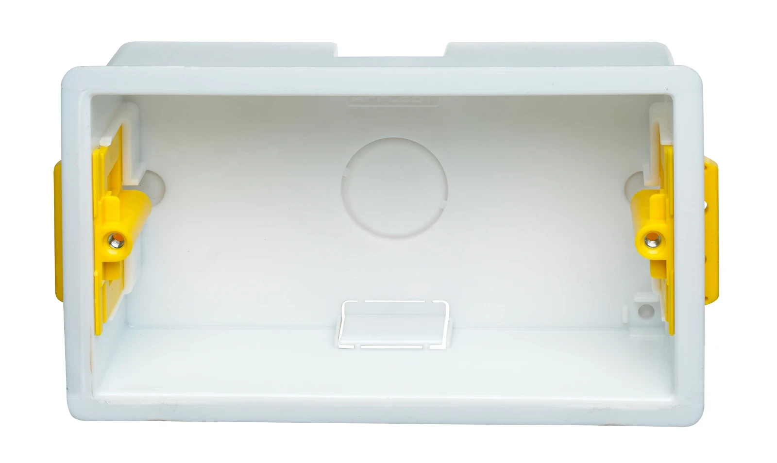 Dry Lining Box with large flange around front prevents slipping into cavity and matches profile of accessory front plate and tough yellow nylon lugs have large bearing faces for superior strength · · · Large flange around front · · Yellow nylon lugs · · 2 side knockout cable entries plus one 25mm base knockout · · Brass earth terminal available · · Tough yellow nylon lugs have large bearing faces for superior strength