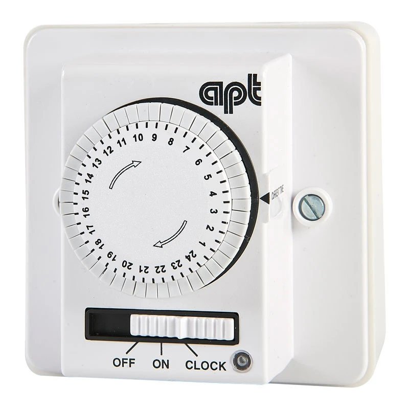 APT Time Switch has been specifically developed to cope with the constantly high amperage draw found with immersion heaters and also the wide variety of domestic or industrial timed operations. A slider switch allows the unit to be set for continuously ON/OFF in addition to the program setting. Terminals which can accommodate 2x 1.5mm conductors are provided. · · · Tappet time selectors allows fast, easy fingertip control · · 30 minutes increment tappets · · 24 hours dial offers the convenience of repeating a cycle daily · · Supplied with surface mounting box containing 2x cable clamps · · Impact resistant housing