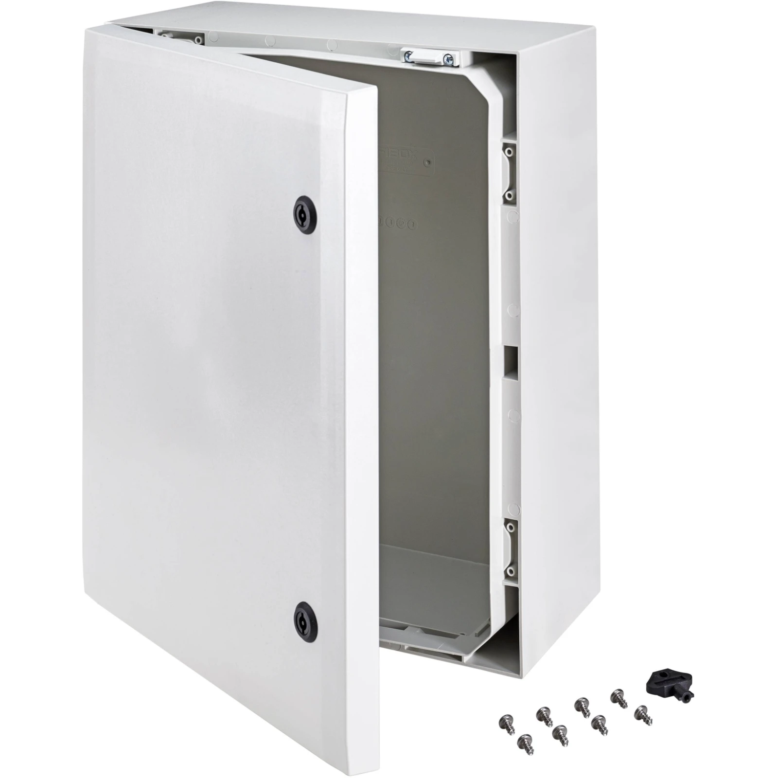 ARCA 504021 Wall Boxes Cabinet, PC Grey cover, 2-point locking, hinges on the long side · · · Polycarbonate Cabinet with hinged door · · IP66 · · Include Mounting Plate · · Hinged · · Lockable with Double Bit Key · · wall mounting · · IP66 · · IK10 · · Corrosion Free · · Flame Resistance: V0 UL94