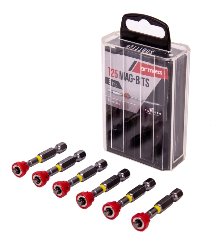Armeg SDBTTT25 Screwdriver Bit 6 Piece Magnetic Collar Tic Tac Box T25 · · · Strong magnetic collar locks onto fastener, holding it firmly in place at any orientation · · Eliminates need to hold fastener giving easier start-ups and maximum user control · · One handed screw driving allows greater reach and flexibilty · · Magnetic collar can be removed allowing screws to be driven below the surface if required · · Colour coded bits for easy size identification · · 6 sizes available · · Stack it – storage boxes stack together for convenience