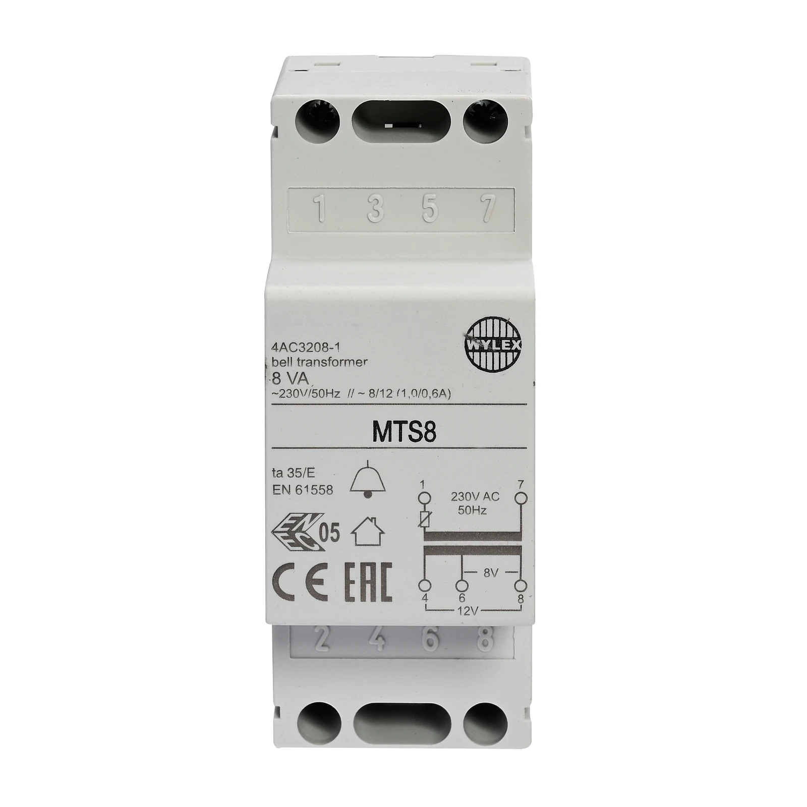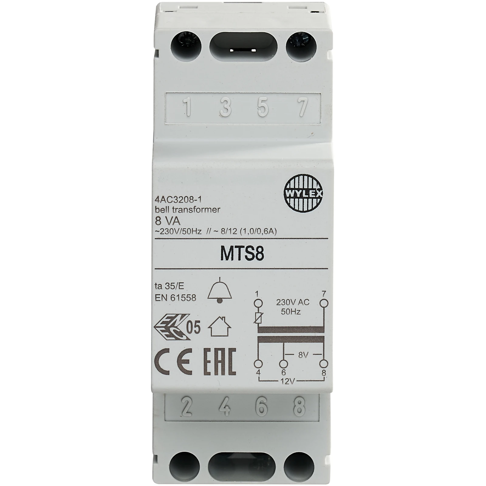 Wylex Bell Transformer with power rating of 8VA and voltage of 12V. · · · Bell transformer, DIN rail mounting · · 8V or 12V Secondary outputs · · Protected against short circuit or moderate overload by PTC resistor · · 2 modules wide