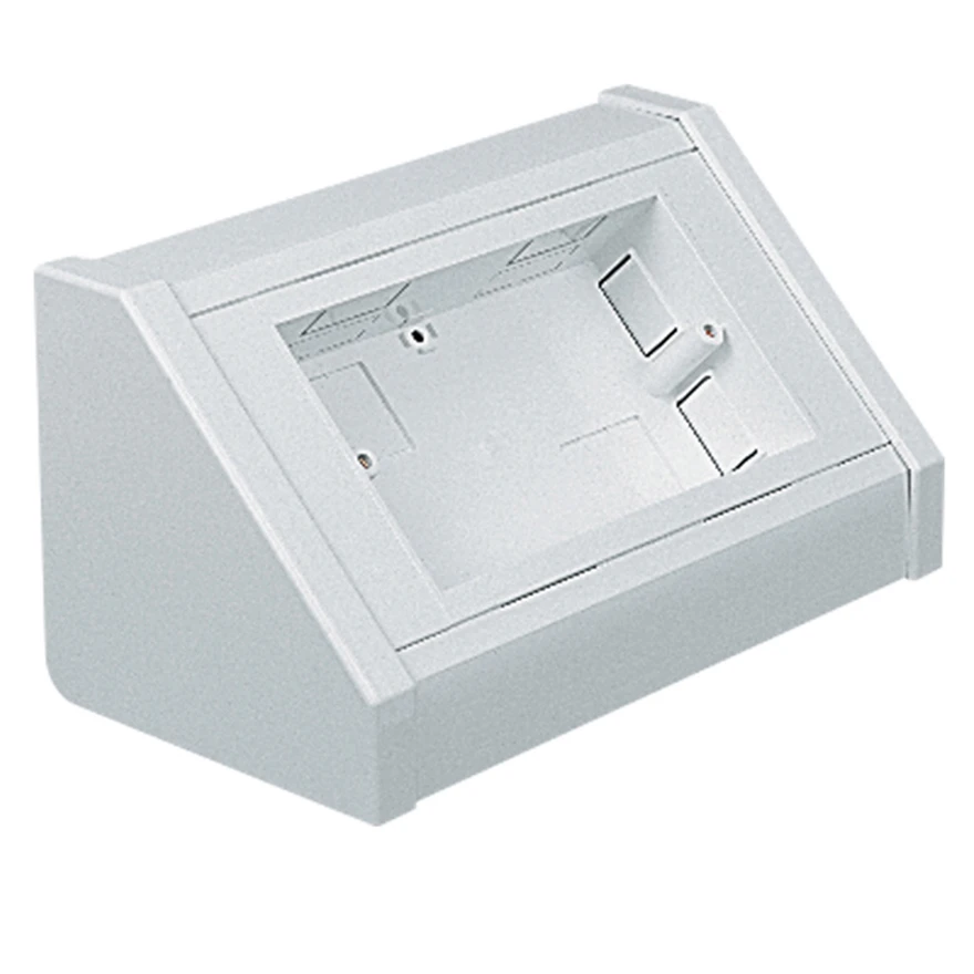Robust Angled Bench Trunking made up of a white polyvinyl chloride (PVC-U) body which can be mounted directly on to desks, work benches or fitted under shelving. · · · Provides 2 gang back box for bench trunking · · Compliant up to Cat 7a · · Can be subdivided · · Compliant up to Cat 7a · · Self extinguishing PVC-U · · ETL1 lid is available in charcoal as a Part M compliance option · · Manufactured using 50% recycled material