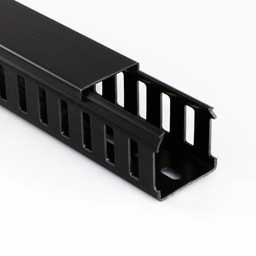 This black 75mm (H) x 25mm (W) Betaduct PVC Closed Slot cable trunking is the ideal solution for general applications where cable management is required, and cable protection is essential. This impact resistant, self-extinguishing PVC trunking provides fast and tidy routing of cables with a high level of mechanical protection, making it ideal for use in control panels, switchboards, production plants and other demanding environments. Features an innovative design for quick and simple installation. Key Features Lightweight and self-extinguishing Excellent rigidity and performance characteristics Easy installation Base holes to DIN 43659 Break points on fingers Secure clip on lid Supplied in 2m lengths Spare Lids Available · · · 8mm slots · · Closed Slot · · 12mm finger width · · 8 x 2m lengths · · Lightweight and self-extinguishing · · Base holes to NF EN 50085 · · Break points on fingers and base · · Supplied in 2m lengths · · UL Recognised: UL 1565 | E509564 · · Flame Resistance: V0 UL94