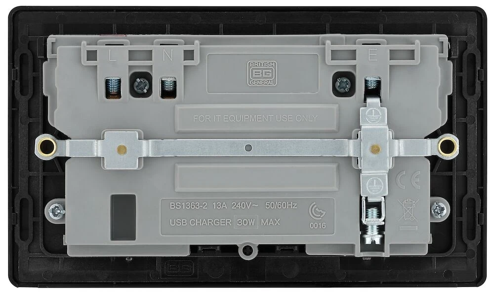 This Evolve Matt Black 13A power socket from British General with integrated fast charge USB-A and USB-C ports delivers a 50% charge to mobile phones in just 30 minutes. These sockets allow you to charge your devices without sacrificing power sockets, and with no need for bulky adaptors. Ideal for retro-fit, simply fit to an existing 25mm back box in the same way you would fit a regular power socket. The Evolve range also features a low profile screwless flat plate that clips on and off, making it ideal for modern interiors. · · · 13A Rated with integrated “fast charge” USB A + C ports · · Easy to install supplied with fixing screws and installation instructions · · Delivers 50% charge to mobile phones in just 30 minutes · · Charge up 70% faster than standard 5V charging · · Supports PD and QC charging protocols and outputs the best voltage & current for optimum charging · · Smart Charging – Intelligently adjusts the voltage to give devices the power they need when they need it, without overcharging · · Screwless front plate clips on and off easily ideal for redecorating · · Twin earth fitted as standard for high integrity circuits · · Angled in-line terminals with captive screws provide easy access for quick installation · · Minimum mounting box depth 35mm