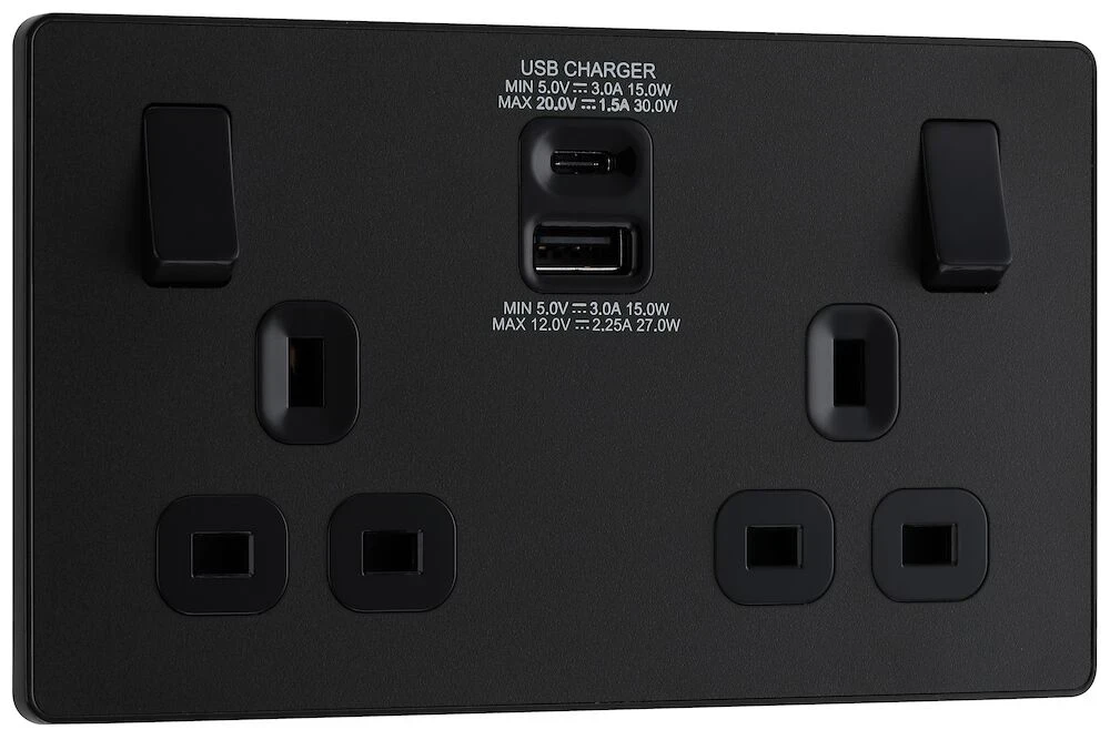 BG Evolve, Matt Black, 13A Double Switched Socket with USB A + C 30W