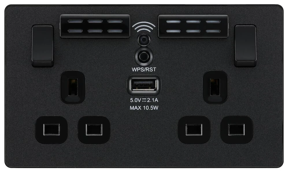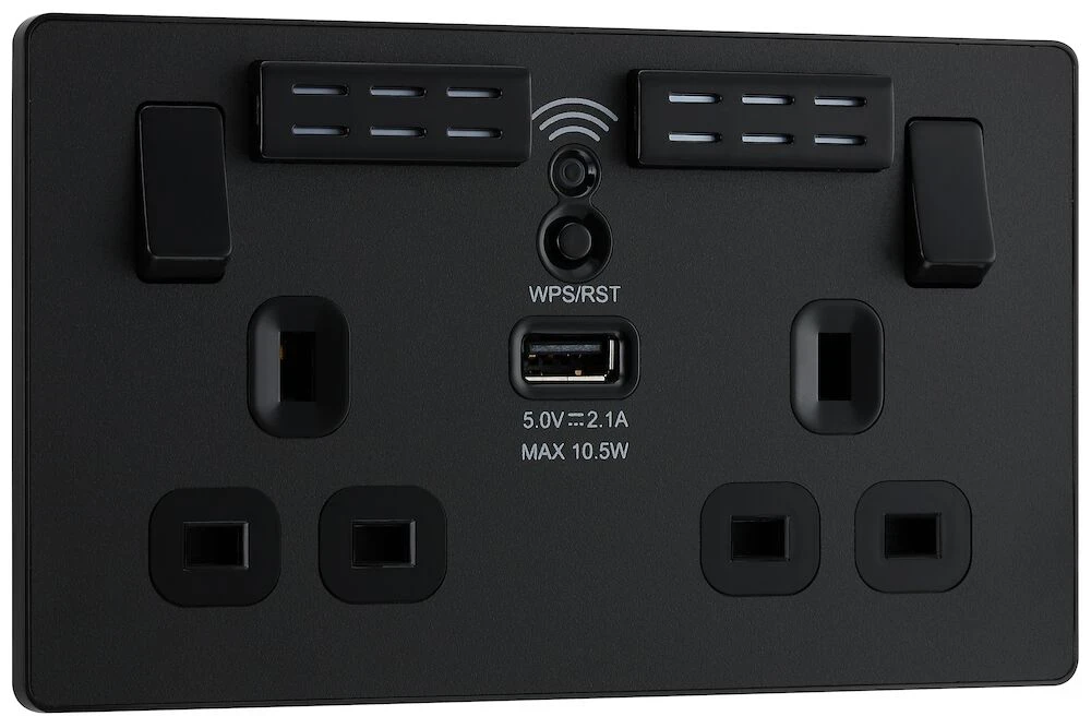 This Evolve Matt Black 13A double power socket with integrated Wi-Fi Extender from British General will eliminate dead spots and expand your Wi-Fi coverage. Designed to work with all wireless broadband routers and easy to install with one touch WPS, this includes a USB charging port and eradicates the need for plug in adaptors, keeping sockets free for use. Ideal for retro-fit, simply fit to an existing 25mm back box in the same way you would fit a regular power socket. The Evolve range also features a low profile screwless flat plate that clips on and off, making it ideal for modern interiors. · · · 13A Rated · · Easy to install supplied with fixing screws and installation instructions · · 1x 2.1A USB outlet for charging your mobile devices · · Improved Wi-Fi coverage throughout your home works with all wireless broadband routers · · Easy to setup with one touch WPS · · Single band (2.4Ghz) · · Angled in-line terminals with captive screws provide easy access for quick installation · · Twin earth fitted as standard for high integrity circuits · · Screwless front plate clips on and off easily ideal for redecorating · · Minimum mounting box depth 35mm