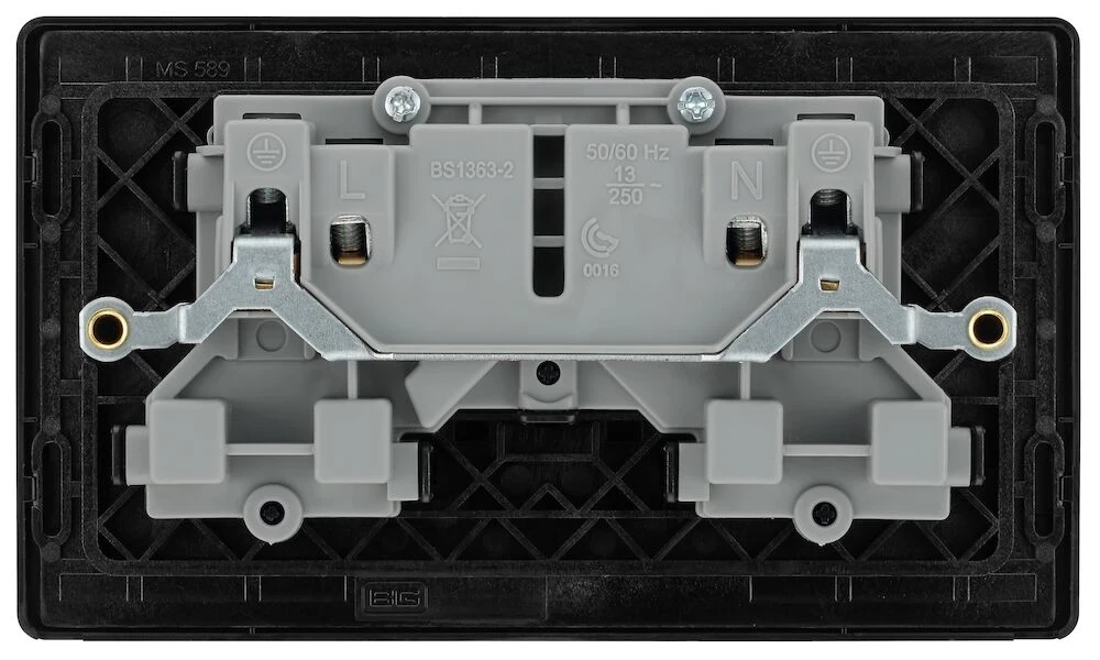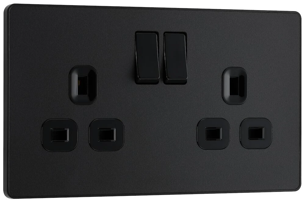 This Evolve Matt Black 13A double switched socket from British General has been designed with angled in line colour coded terminals and backed out captive screws for ease of installation, and fits a 25mm back box making it an ideal retro-fit replacement for existing sockets. The socket has a low profile screwless flat plate that clips on and off, making it ideal for modern interiors. · · · 13A Rated · · Easy to install supplied with fixing screws and installation instructions · · Angled colour coded in-line terminals provide easy access for quick installation · · Twin earth fitted as standard for high integrity circuits · · Screwless front plate clips on and off easily ideal for redecorating · · Minimum mounting box depth 35mm · · Certified to BS1363-2 and BS 7671:2008 · · ASTA Licence number 1013