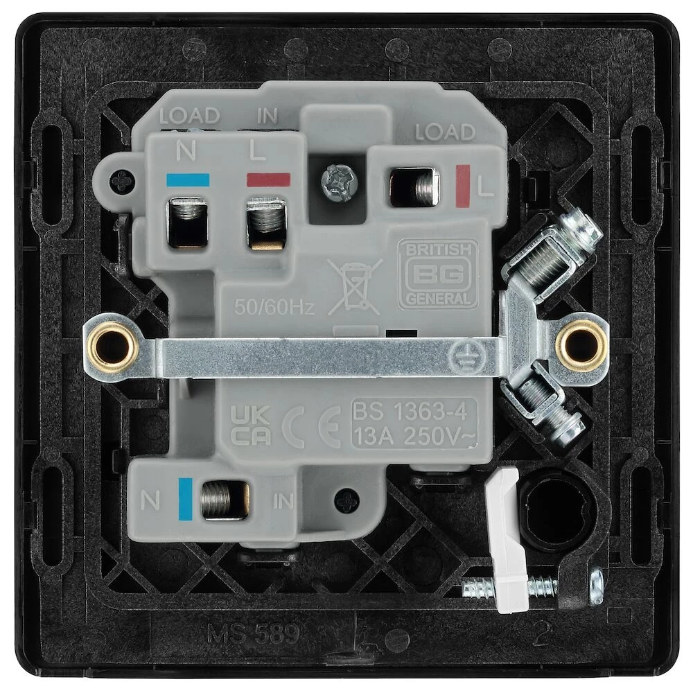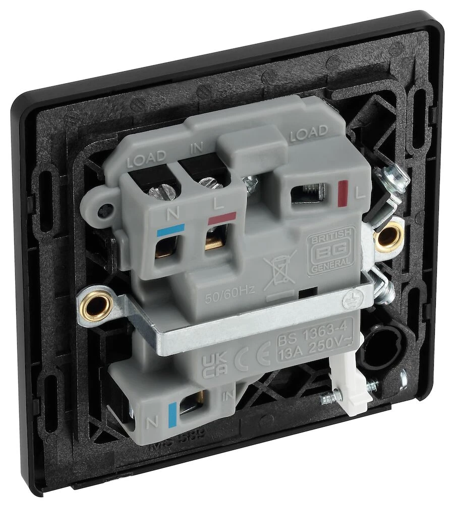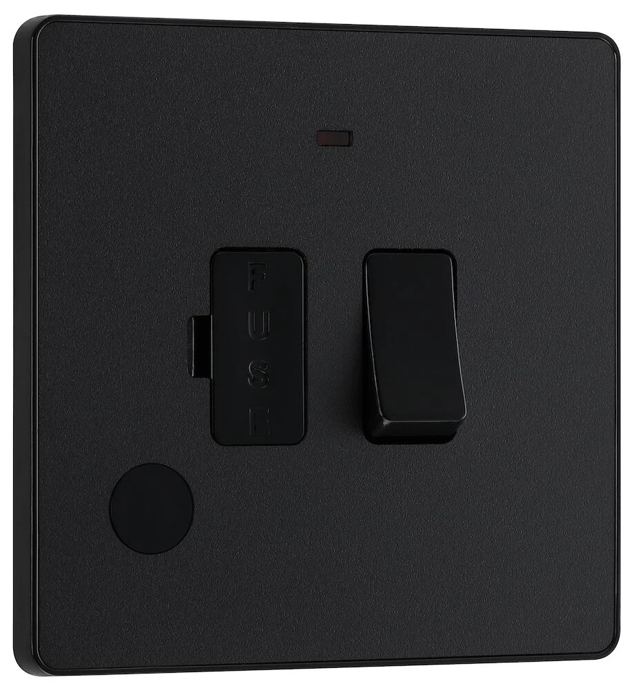 This Evolve Matt Black 13A fused and switched connection unit from British General with power indicator provides an outlet from the mains containing the fuse, ideal for spur circuits and hardwired appliances. This FCU has a low profile screwless flat plate that clips on and off, making it ideal for modern interiors. · · · 13A Rated · · Easy to install supplied with fixing screws and installation instructions · · Ideal for spur circuits and hard wired power appliances · · Colour coded terminals for easy identification · · Captive screws prevent screw loss · · Flush LED power indicator · · Screwless front plate clips on and off easily ideal for redecorating · · Minimum mounting box depth 35mm · · Certified to BS 1363 Part 4 · · ASTA Licence number 1015