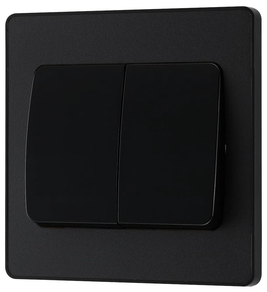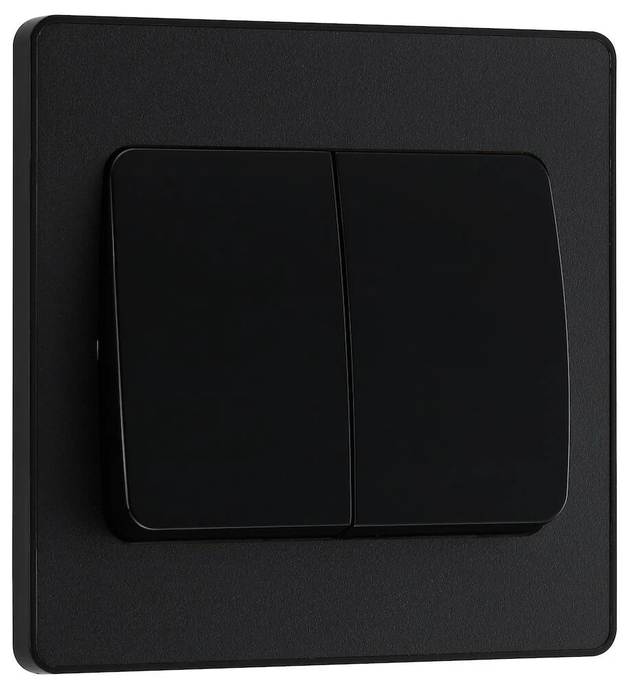 This Evolve Matt Black 20A 16AX double light switch from British General can operate 2 different lights, whilst the 2 way switching allows a second switch to be added to the circuit to operate the same light from another location (e.g. at the top and bottom of the stairs). This switch has a wide rocker and a low profile screwless flat plate that clips on and off, making it ideal for modern interiors. · · · 20A 16AX Rated · · Easy to install supplied with fixing screws and installation instructions · · 2 way switching allows for a second switch position in a circuit · · Captive backed out terminal screws for fast installation and to prevent screw loss · · Screwless front plate clips on and off easily ideal for redecorating · · Wide rocker switch – large touch point for ease of operation · · Minimum mounting box depth 25mm · · Certified to BS60669-1 · · ASTA Licence number 1010