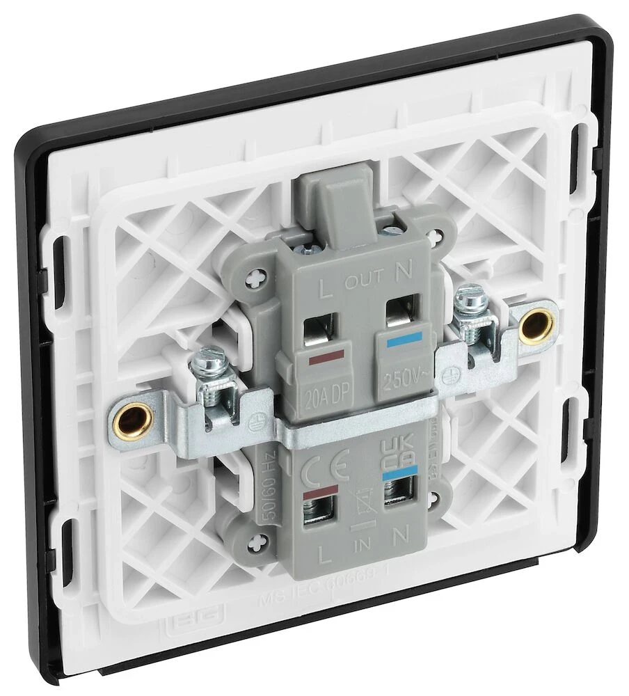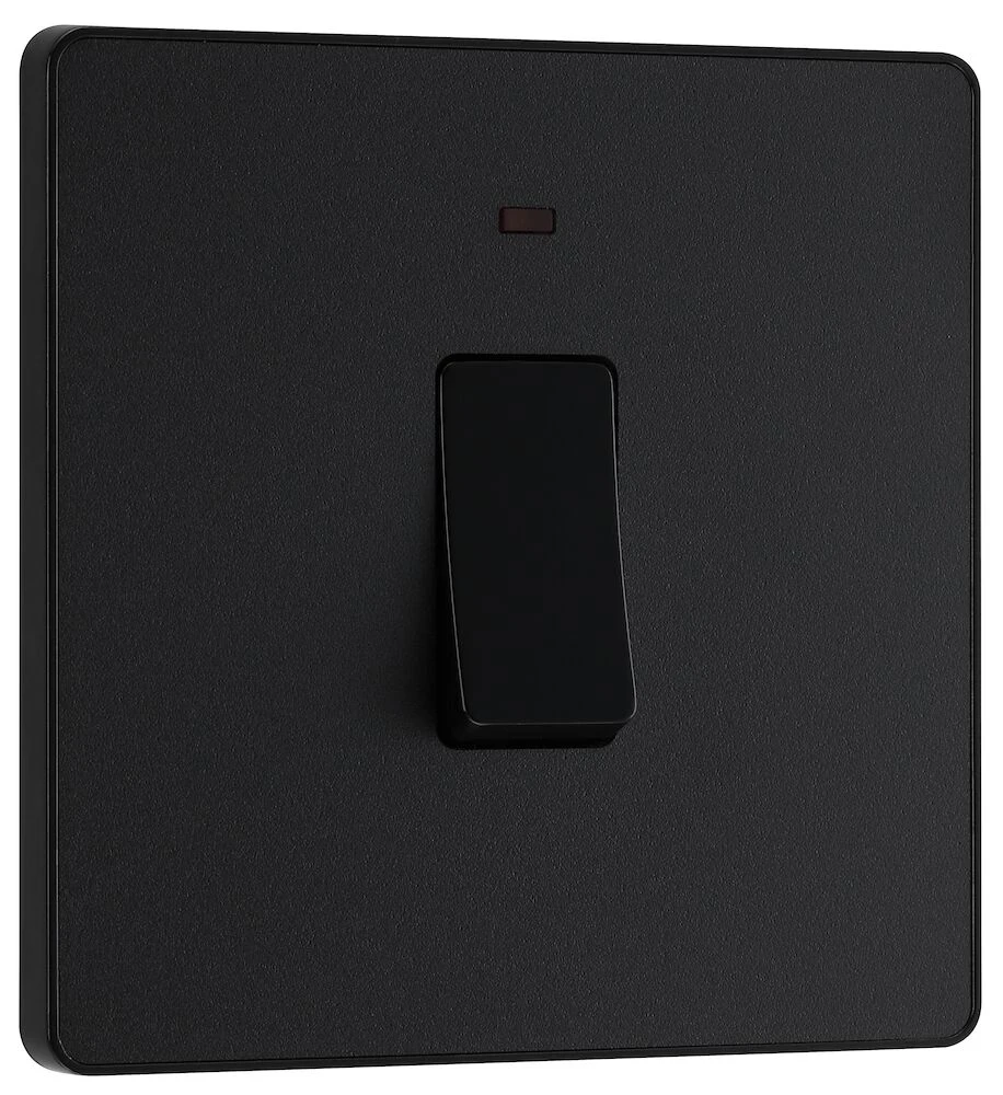 This Evolve Matt Black 20A double pole switch with indicator from British General has been designed for the connection of refrigerators, water heaters, central heating boilers and many other fixed appliances. This switch has a low profile screwless flat plate that clips on and off, making it ideal for modern interiors. · · · 20A Rated · · Easy to install supplied with fixing screws and installation instructions · · Suitable for use with refrigerators water heaters, central heating boilers and many other fixed appliances · · Double Pole switching for the peace of mind of a safer installation · · Colour coded terminals for easy identification · · Captive backed out terminal screws for fast installation and to prevent screw loss · · Flush LED power indicator · · Screwless front plate clips on and off easily ideal for redecorating · · Minimum mounting box depth 25mm · · Certified to BS60669-1