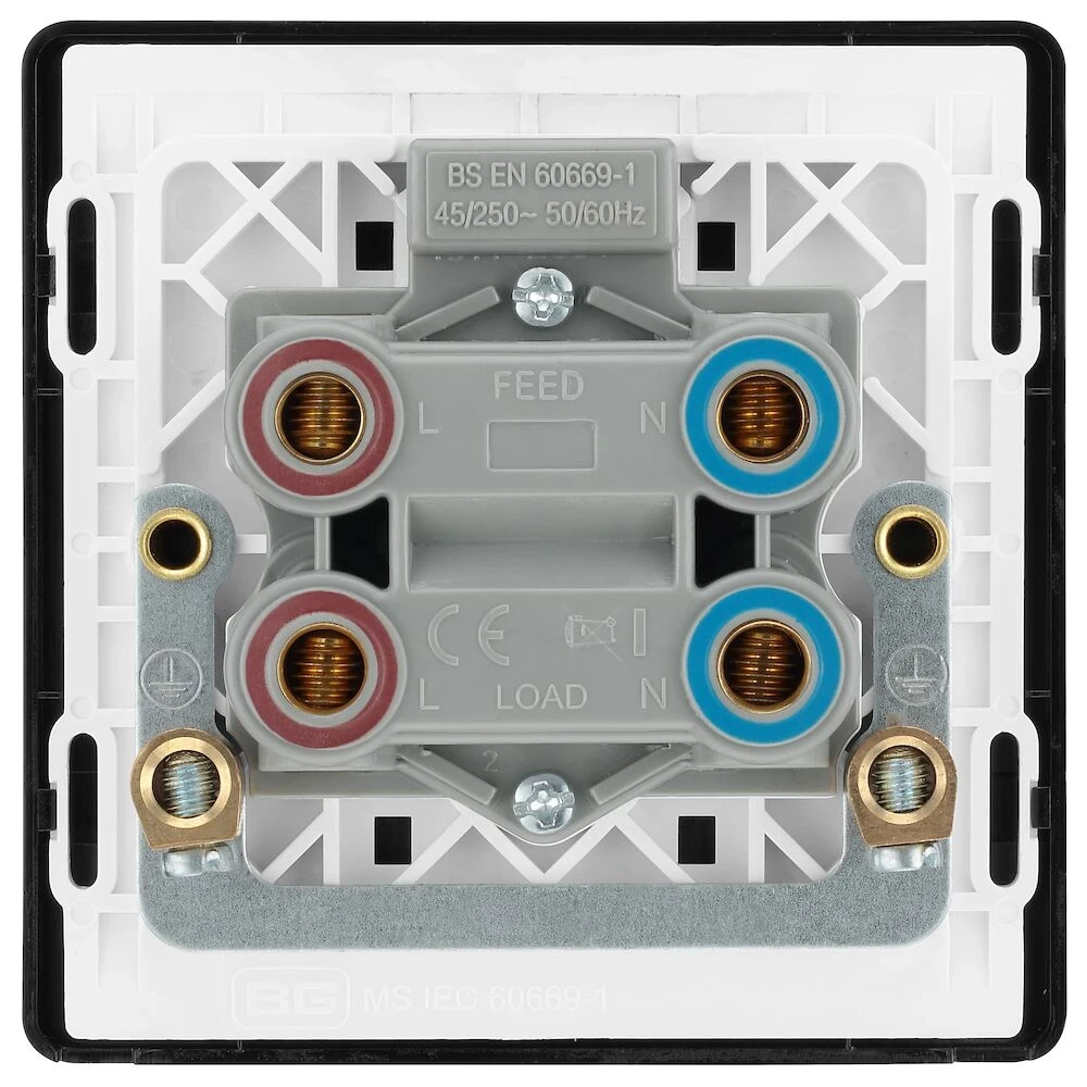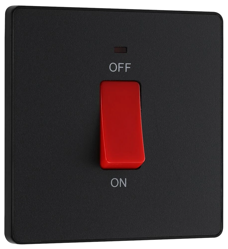 This Evolve Matt Black 45A double pole switch with indicator from British General is ideal for use with cookers and ovens. This switch has a low profile screwless flat plate that clips on and off, making it ideal for modern interiors. · · · 45A Rated · · Easy to install supplied with fixing screws and installation instructions · · Ideal for cookers and ovens · · Double Pole switching for the peace of mind of a safer installation · · Twin earth fitted as standard for high integrity circuits · · Colour coded terminals for ease of identification · · Flush LED power indicator · · Screwless front plate clips on and off easily ideal for redecorating · · Captive screws prevent screw loss · · Minimum mounting box depth 47mm
