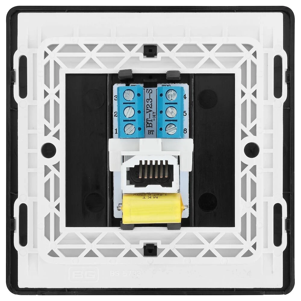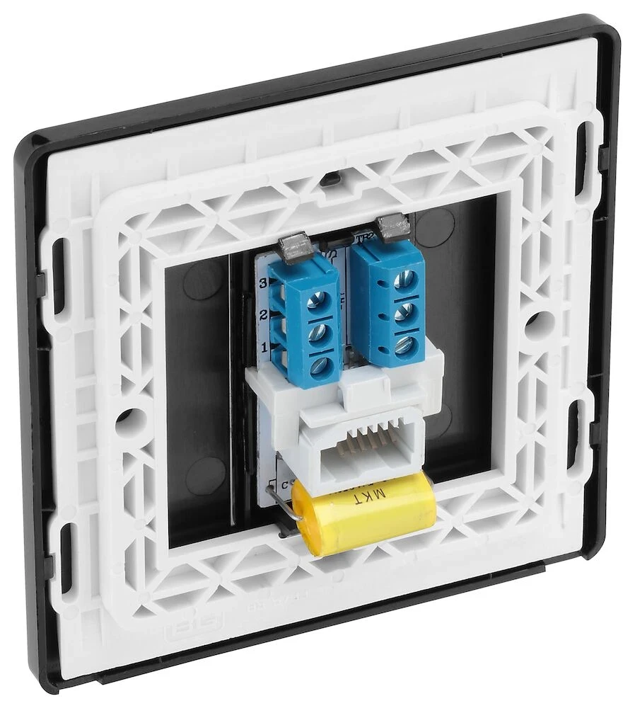 This Evolve Matt Black master telephone socket from British General uses a screw terminal connection, and should be used where your telephone line enters your property. This is the best place to connect your router as it”s where you”re most likely to get the best performance and fastest speeds for your broadband. If you have more than one socket, the master socket is the one that will feed any extension sockets. This socket has a low profile screwless flat plate that clips on and off, making it ideal for modern interiors. · · · Screw terminals · · Easy to install supplied with fixing screws and installation instructions · · Used for the main telephone socket · · Screwless front plate clips on and off easily ideal for redecorating · · Shuttered socket · · Minimum mounting box depth 35mm · · Certified to BS6312-2 · · ASTA Licence number 1018