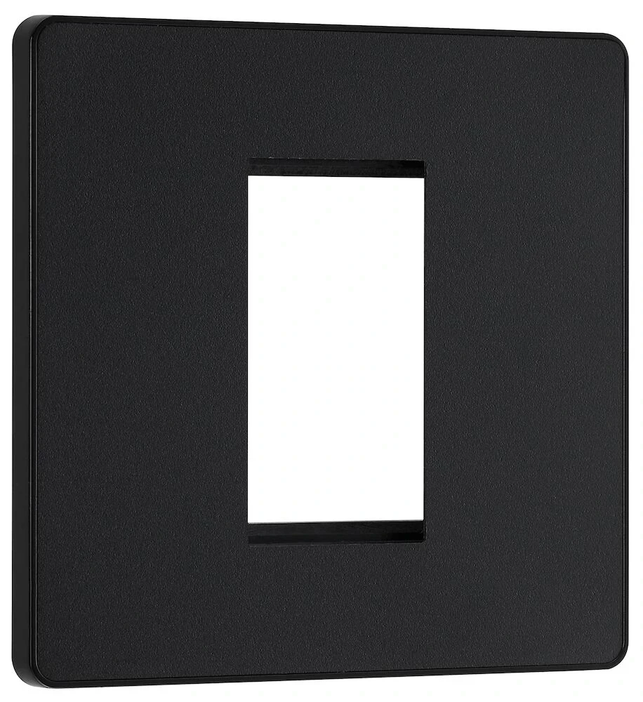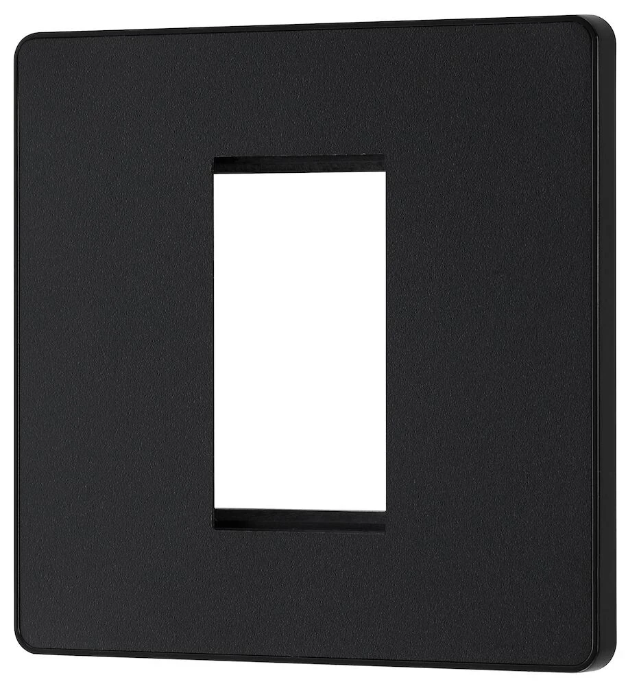 The Euro Module range from British General combines plates and interchangeable modules so you can configure your own bespoke switches and sockets. This Evolve Matt Black plate aperture can accommodate one 25mm wide module, and has a low profile screwless flat plate that clips on and off, making it ideal for modern interiors. · · · Evolve Euro Module front plate for full customisation of outlets · · Aperture size 25mm wide x 50mm high · · Compatible with the wider Euro Module range of products · · Certified to BS5733