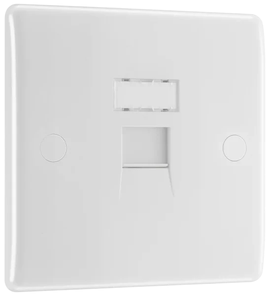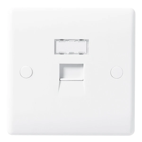 BG Electrical 8RJ45/1 White Plastic Slim Single RJ45 Data Outlet Socket 1 Gang. The BG Nexus 8RJ45/1 white plastic wiring accessories benefit from a 30 year guarantee and screw covers for a sleek appearance. · · · RJ45 data outlet socket · · This product is supplied with Cat6 modules, but is also compatible with Cat5e cable · · Sleek Modern Profile · · Screw Covers Hide Screw Heads