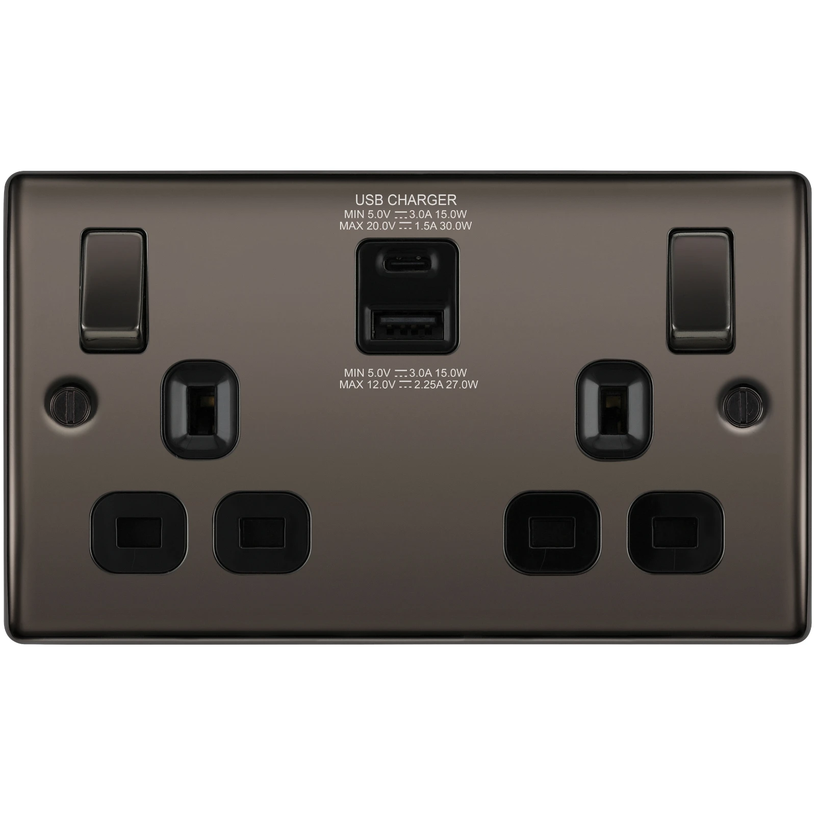 BG Nexus NBN22UAC30B Black Nickel 13A 2 Gang Socket Grey Insert With USB C – 30W Fast Charge