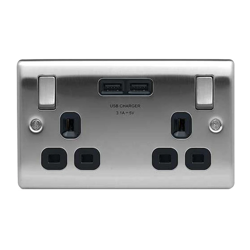 BG Nexus NBS22U3B Brushed Steel Switched Socket 2 Gang 13A 3.1A USB with Black Insert