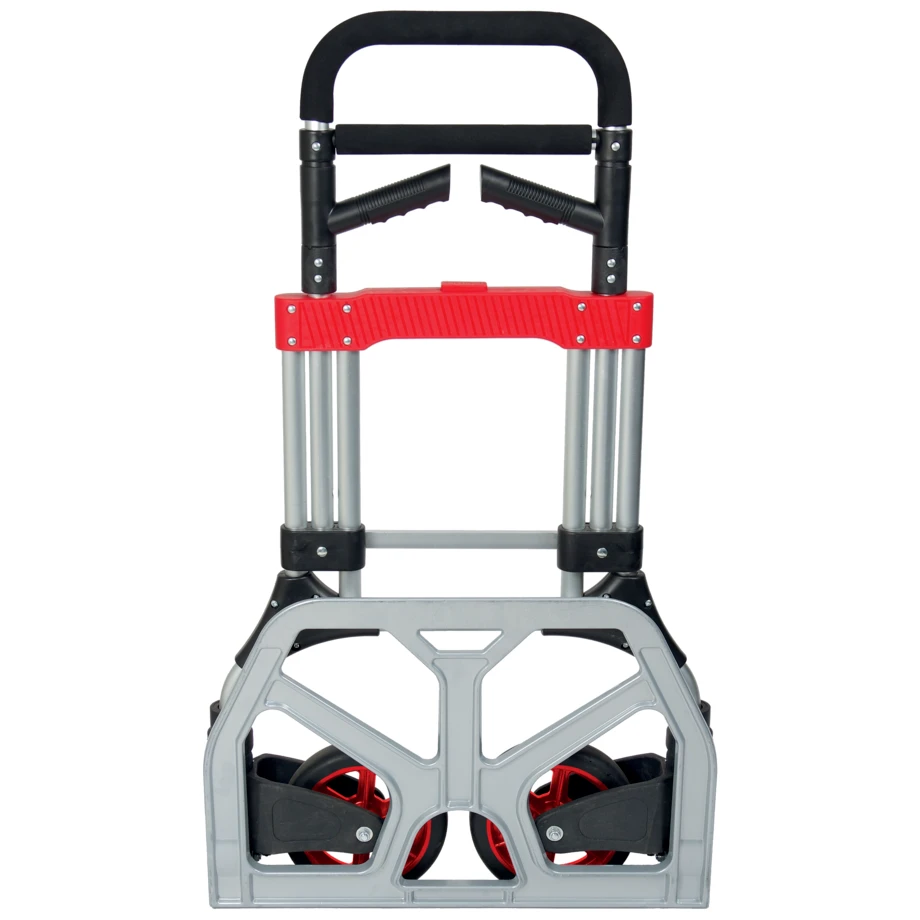 Telescopic aluminium folding trolley with 200-kg loading capacity. Practical: foldable, ergonomic plastic handles. Wheels can be folded away. · · · Aluminium telescopic folding hand truck with a 200 kg load capacity. · · Maximum payload (kg): 200. · · Ergonomic folding plastic handles. · · Folding aluminium toe plate (mm): 590 x 400. · · Retractable wheels. · · 2 wheels with TPR tyres 200 mm on plastic rim (polypropylene material). · · Folded dimensions (mm): 590 x 80 x 1030. · · Unfolded dimensions (mm): 610 x 600 x 1220. · · Weight (kg): 11.
